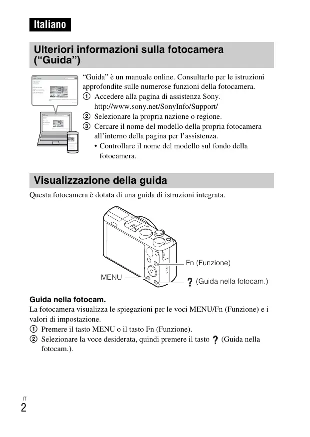 Italiano Ulteriori informazioni sulla fotocamera (“Guida”) “Guida” è un manuale online. Consultarlo per le istruzioni approfondite sulle numerose funzioni della fotocamera. 1 Accedere alla pagina di assistenza Sony. http://www.sony.net/SonyInfo/Support/ 2 Selezionare la propria nazione o regione. 3 Cercare il nome del modello della propria fotocamera all’interno della pagina per l’assistenza.