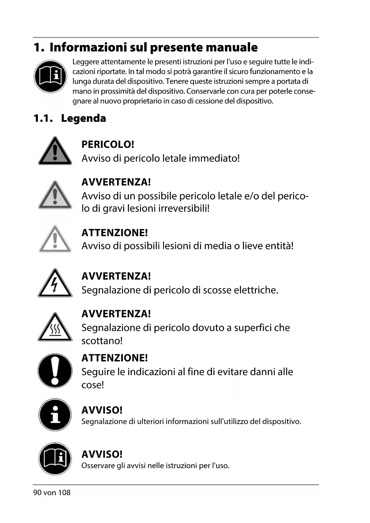 Leggere attentamente le presenti istruzioni per l’uso e seguire tutte le indi- cazioni riportate. In tal modo si potrà garantire il sicuro funzionamento e la lunga durata del dispositivo. Tenere queste istruzioni sempre a portata di mano in prossimità del dispositivo. Conservarle con cura per poterle conse- gnare al nuovo proprietario in caso di cessione del dispositivo. 1.1. Legenda PERICOLO! Avviso di pericolo letale immediato! AVVERTENZA! Avviso di un possibile pericolo letale e/o del perico- lo di gravi lesioni irreversibili! ATTENZIONE! Avviso di possibili lesioni di media o lieve entità! AVVERTENZA! Segnalazione di pericolo di scosse elettriche. AVVERTENZA! Segnalazione di pericolo dovuto a superfici che scottano! ATTENZIONE! Seguire le indicazioni al fine di evitare danni alle cose! AVVISO! Segnalazione di ulteriori informazioni sull'utilizzo del dispositivo. AVVISO! Osservare gli avvisi nelle istruzioni per l'uso.DE