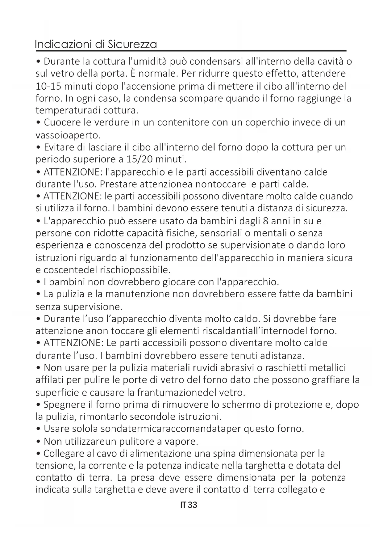 L’uso di un qualsiasiapparecchio elettricocomportal’osservanza di alcune regole fondamentali: - non tirareil cavodi alimentazione per staccare la spina della presa di corrente; - non toccarel’apparecchiocon mani o piedi bagnati o umidi; - in generale è sconsigliabile l’usodi adattatori,presemultiple e prolunghe; - in caso di guastoe/o cattivofunzionamentodell’apparecchio, spegnerlo e non manometterlo. Utilizzare il forno solo per lo scopo per cui è stato progettato, ossia solo per la cottura di alimenti; qualsiasi altro utilizzo, ad esempio come fonte di riscaldamento, è considerato improprio e quindi pericoloso. Il costruttore non può essere considerato responsabile per eventuali danni derivanti da usi impropri,erroneied irragionevoli.