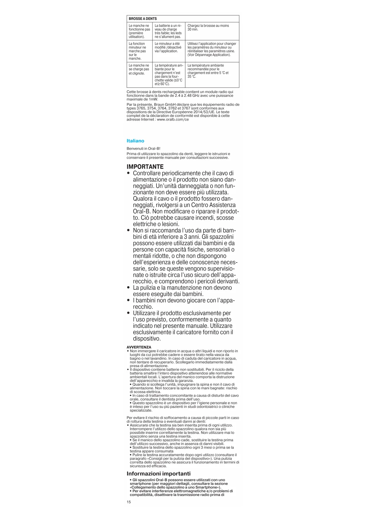 2. Attivare l’interfaccia Bluetooth sullo smartphone, seguendo le istruzioni riportate nel manuale dello smartphone.3. Attivare la trasmissione radio premendo il tasto on/off (c) per 3 secondi.4. Premere due volte rapidamen-te il tasto on/off dello spazzo-lino (c) per riattivare la connessione o ricollegare spazzolino e smartphone tramite le impostazioni della app. Tenere lo smartphone a stretta vicinanza quando lo si utilizza insieme allo spaz-zolino.5. Per potere effettuare il collegamento con lo spazzoli-no, lo smartphone deve supportare il protocollo Bluetooth 4.0 (o superiore)/Bluetooth Smart.6. La trasmissione radio è disattivata quando lo spazzolino è appoggiato sul caricatore.Reset alle impostazioni di fabbrica.Ripristinare le funzionalità originarie dell’apparecchio.Tenere premuto il tasto on/off (c) per 10 secondi, fin quando tutte le spie (b, e & f) non lampeggiano due volte simultaneamente.Nota: la trasmissione radiopotrebbe essere (dis)attivata durante il reset. Dopo il reset la trasmissione radio è riattivata.SPAZZOLINOLo spazzolino non funziona (durante il primo utilizzo).Il livello di carica della batteria è molto basso; le spie non si accendono.Ricaricare per almeno 30 minuti.Sullo spazzolino non funziona nessun timer.Il timer è stato modificato/disattivato tramite l’app.Utilizzare l’app per modificare le impostazioni del timer o effettuare un reset alle impostazioni di fabbrica (vedere Risoluzione problemi app).Il manico non si ricaricaLa temperatura ambiente per la ricarica è fuori dall’intervallo di validità ( 0 °C e 60 °C).La temperatura ambiente consigliata per la ricarica è tra i 5°C e i 35°C.Questo spazzolino ricaricabile contiene un dispositivo radio che opera nella banda 2,4 - 2,48 GHz con una potenza massima di 1mW. Con la presente, Braun GmbH dichiara che il dispositivo dei modelli 3765, 3754, 3764, 3762 e 3767 è conforme alla Direttiva 2014/53/UE. Il testo integrale della dichiarazione di conformità UE è disponibile al seguente indirizzo internet: www.oralb.com/ce Nederlands Welkom bij Oral-B!Lees voor het gebruik van dit apparaat de gebruiksaanwijzing aandachtig door en houd deze bij voor toekomstig gebruik. BELANGRIJK