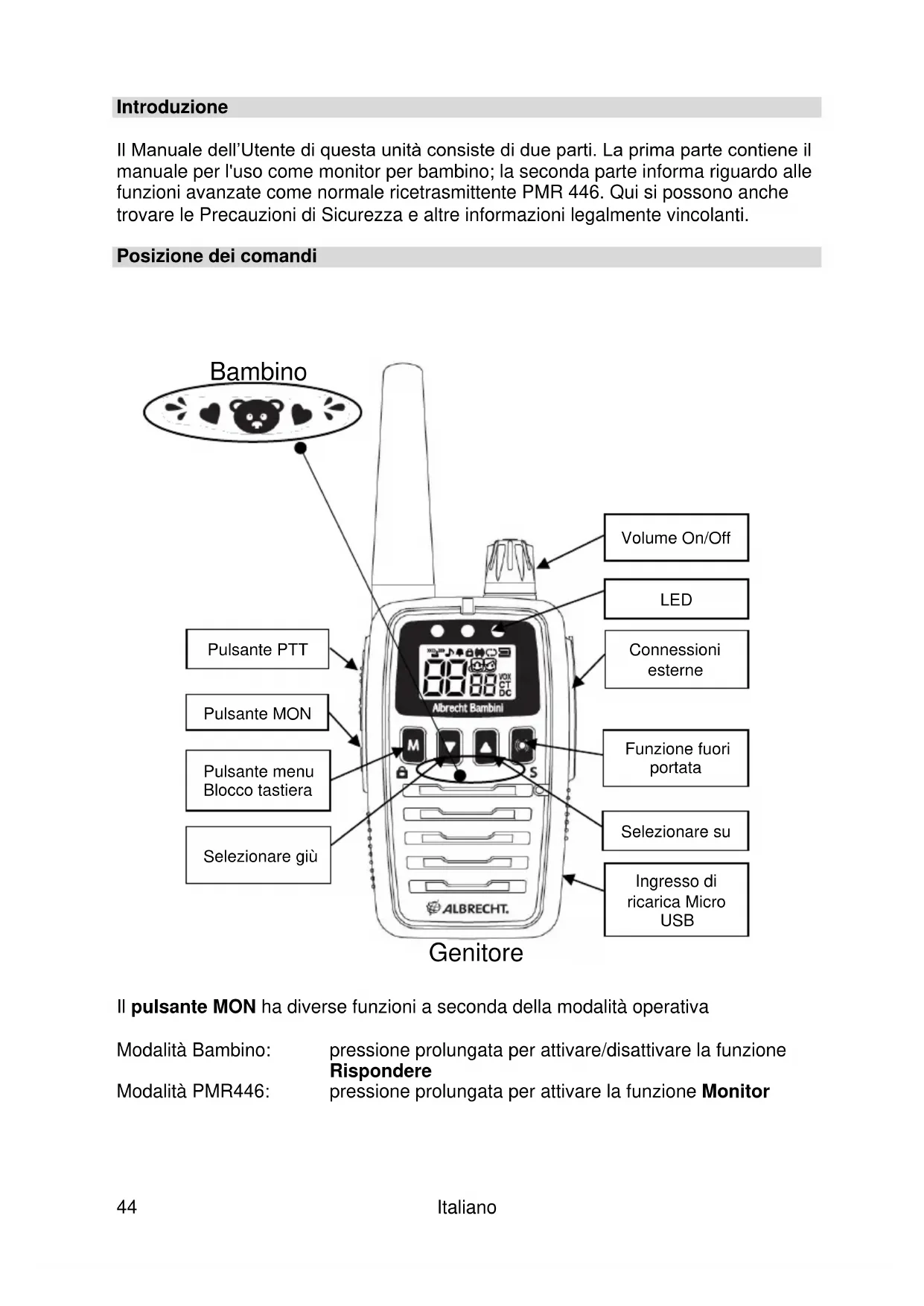 Il pulsante MON ha diverse funzioni a seconda della modalità operativa Modalità Bambino: pressione prolungata per attivare/disattivare la funzione Rispondere Modalità PMR446: pressione prolungata per attivare la funzione Monitor