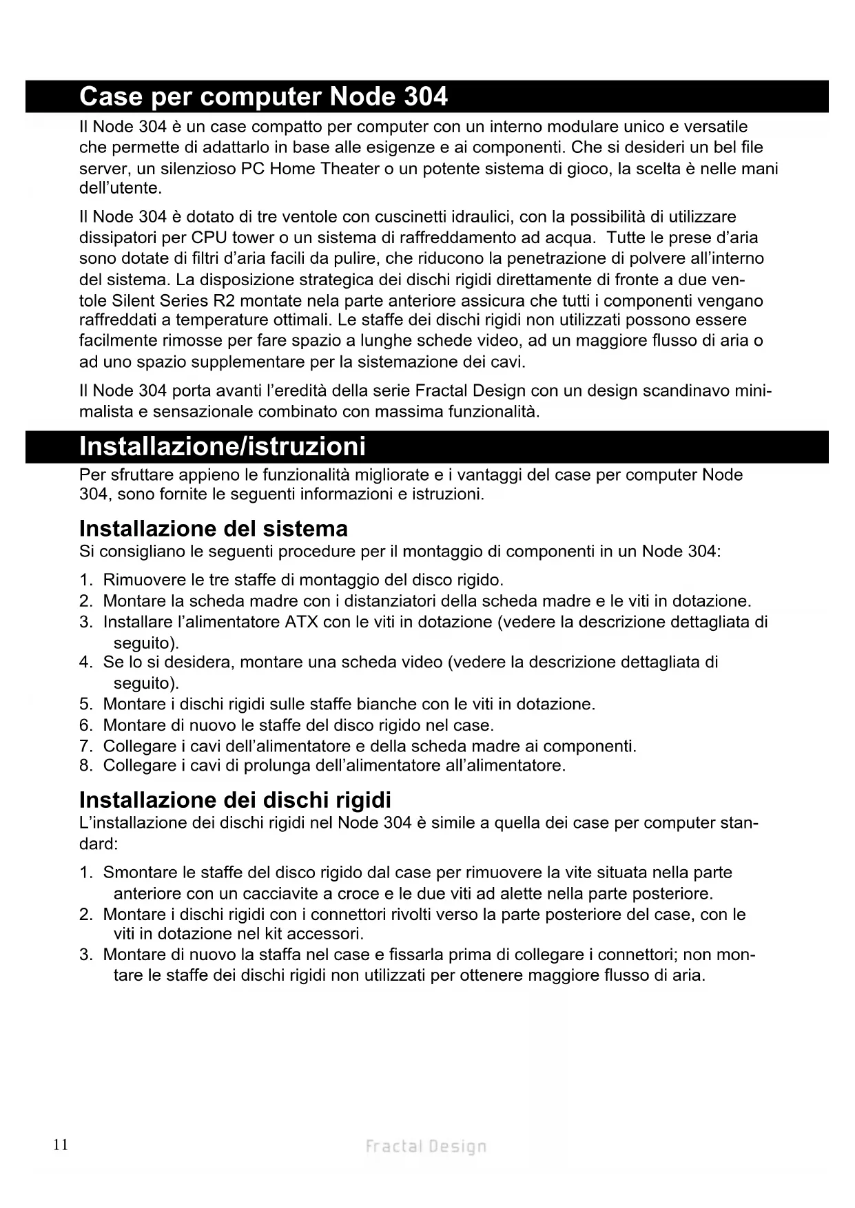 Case per computer Node 304 Il Node 304 è un case compatto per computer con un interno modulare unico e versatile che permette di adattarlo in base alle esigenze e ai componenti. Che si desideri un bel le server, un silenzioso PC Home Theater o un potente sistema di gioco, la scelta è nelle mani dell’utente. Il Node 304 è dotato di tre ventole con cuscinetti idraulici, con la possibilità di utilizzare dissipatori per CPU tower o un sistema di raffreddamento ad acqua. Tutte le prese d’aria sono dotate di ltri d’aria facili da pulire, che riducono la penetrazione di polvere all’interno del sistema. La disposizione strategica dei dischi rigidi direttamente di fronte a due ven- tole Silent Series R2 montate nela parte anteriore assicura che tutti i componenti vengano raffreddati a temperature ottimali. Le staffe dei dischi rigidi non utilizzati possono essere facilmente rimosse per fare spazio a lunghe schede video, ad un maggiore usso di aria o ad uno spazio supplementare per la sistemazione dei cavi. Il Node 304 porta avanti l’eredità della serie Fractal Design con un design scandinavo mini- malista e sensazionale combinato con massima funzionalità. Installazione/istruzioni Per sfruttare appieno le funzionalità migliorate e i vantaggi del case per computer Node 304, sono fornite le seguenti informazioni e istruzioni. Installazione del sistema Si consigliano le seguenti procedure per il montaggio di componenti in un Node 304: