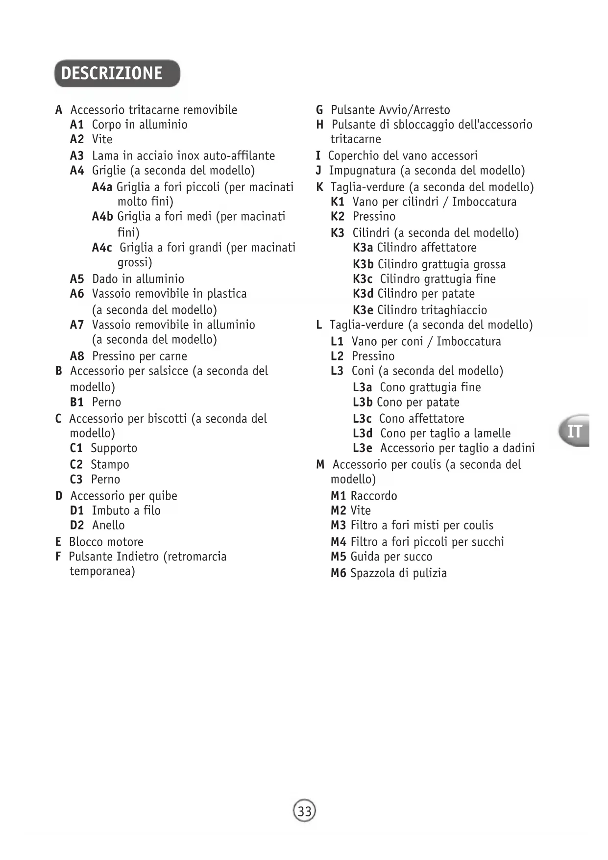 DESCRIZIONE A Accessorio tritacarne removibile A1 Corpo in alluminio A2 Vite A3 Lama in acciaio inox auto-affilante A4 Griglie (a seconda del modello) A4a Griglia a fori piccoli (per macinati molto fini) A4b Griglia a fori medi (per macinati fini) A4c Griglia a fori grandi (per macinati grossi) A5 Dado in alluminio A6 Vassoio removibile in plastica (a seconda del modello) A7 Vassoio removibile in alluminio (a seconda del modello) A8 Pressino per carne B Accessorio per salsicce (a seconda del modello) B1 Perno C Accessorio per biscotti (a seconda del modello) C1 Supporto C2 Stampo C3 Perno D Accessorio per quibe D1 Imbuto a filo D2 Anello E Blocco motore F Pulsante Indietro (retromarcia temporanea) G Pulsante Avvio/Arresto H Pulsante di sbloccaggio dell'accessorio tritacarne I Coperchio del vano accessori J Impugnatura (a seconda del modello) K Taglia-verdure (a seconda del modello) K1 Vano per cilindri / Imboccatura K2 Pressino K3 Cilindri (a seconda del modello) K3a Cilindro affettatore K3b Cilindro grattugia grossa K3c Cilindro grattugia fine K3d Cilindro per patate K3e Cilindro tritaghiaccio L Taglia-verdure (a seconda del modello) L1 Vano per coni / Imboccatura L2 Pressino L3 Coni (a seconda del modello) L3a Cono grattugia fine L3b Cono per patate L3c Cono affettatore L3d Cono per taglio a lamelle L3e Accessorio per taglio a dadini M Accessorio per coulis (a seconda del modello) M1 Raccordo M2 Vite M3 Filtro a fori misti per coulis M4 Filtro a fori piccoli per succhi M5 Guida per succo M6 Spazzola di pulizia34