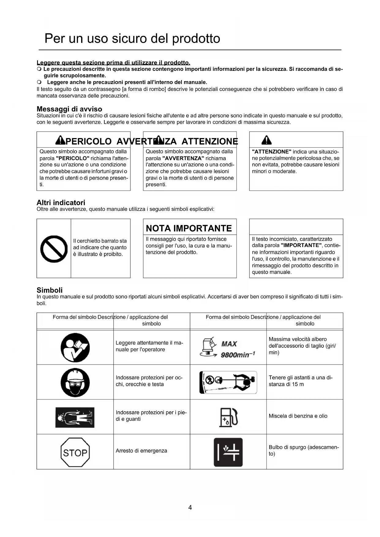 AVVERTENZA Avviamento del motore Prestare particolare attenzione alle seguenti precauzioni quando si avvia il motore: Controllare che non ci siano dadi o bulloni allentati. Controllare che non vi siano perdite di carburante Collocare il prodotto su una superficie piana e ben ventilata. Lasciare sufficiente spazio intorno al prodotto e non permettere a persone o animali di avvicinarsi Avviare il motore con la leva del gas in folle Mantenere il prodotto fermo a terra durante l'avvio del motore La mancata osservanza di queste precauzioni può provocare incidenti, lesioni o perfino la morte. Una volta avviato il motore, verificare che non ci siano vibrazioni e rumori anomali Una volta avviato il motore, verificare che non ci siano vibrazioni o rumori anomali. Non utilizzare il prodotto se ci sono vibrazioni o rumori anomali. Contattare il rivenditore per la riparazione. Incidenti che provocano la caduta o la rottura di parti possono causare ferite o lesioni gravi. Non toccare i componenti ad alta temperatura o ad alta tensione mentre il prodotto è in moto Non toccare i seguenti componenti ad alta temperatura o ad alta tensione mentre il prodotto è in moto o è stato appena spento. Marmitta, candela, trasmissione angolare e altri componenti ad alta temperatura Il contatto con componenti ad alta temperatura potrebbe causare ustioni. Candela, cavo candela e altri componenti ad alta tensione Il contatto con componenti ad alta tensione mentre il prodotto è in moto potrebbe causare scosse elettriche. Dare assoluta priorità alla sicurezza in caso di incendio o fumo In caso di fuoriuscita di fiamme dal motore o di fumo da qualsiasi area diversa dallo sfiato della marmit- ta, allontanarsi dal prodotto per evitare lesioni gravi. Utilizzare una pala per lanciare sabbia o altro materiale simile sul fuoco per evitarne l'espansione o spe- gnerlo con un estintore. Evitare di farsi prendere dal panico per non allargare l'incendio o aumentare i danni.8 Per un uso sicuro del prodotto Gestione del prodotto Precauzioni generali I gas di scarico sono tossici I gas di scarico provenienti dal motore contengono gas tossici. Non utilizzare il prodotto in ambienti chiusi o scarsamente ventilati. I gas di scarico possono provocare avvelenamento. Durante il controllo o la manutenzione del prodotto spegnere il motore Osservare le seguenti precauzioni durante il controllo e la manutenzione del prodotto dopo l'uso: Spegnere il motore ed eseguire il controllo o la manutenzione del prodotto solo dopo che il motore si è raffreddato. Interventi a motore caldo potrebbero causare ustioni. Prima di eseguire il controllo e la manutenzione rimuovere il cappuccio della candela. Un'avvio imprevisto del prodotto potrebbe causare un incidente. Controllo della candela Osservare le seguenti precauzioni durante il controllo della candela. Se i terminali degli elettrodi sono usurati o se le parti in ceramica presentano spac- cature, sostituirli con componenti nuovi. Il test di scintillamento (per verificare se la candela genera scintille) deve essere ese- guito dal rivenditore. Il test di scintillamento non deve essere eseguito in prossimità del foro della candela. l test di scintillamento non deve essere eseguito vicino a perdite di carburante o gas infiammabili. Non toccare le parti metalliche della candela La candela può generare fiamme o scosse elettriche. AVVERTENZA AVVERTENZA Manuale per l'operatore Per un corretto funzionamento del prodotto, prima di utilizzarlo leggere attentamente il manuale per l'operatore. La mancata osservanza di queste precauzioni potrebbe causare un incidente o lesioni. Non utilizzare il prodotto per eseguire lavori diversi da quelli per cui è stato progettato Non utilizzare il prodotto per eseguire lavori diversi da quelli descritti nel manuale dell'operatore. La mancata osservanza di queste precauzioni potrebbe causare un incidente o lesioni gravi. Non modificare il prodotto Non modificare il prodotto. La mancata osservanza di queste precauzioni potrebbe causare un incidente o lesioni gravi. Qualsiasi guasto causato da modifiche apportate al prodotto non sarà coperta dalla garanzia del produttore. Non utilizzare il prodotto senza aver effettuato prima il controllo e la manutenzione Non utilizzare il prodotto senza aver effettuato prima il controllo e la manutenzione. Accertarsi sempre che il control- lo e la manutenzione vengano eseguiti a scadenze regolari. La mancata osservanza di queste precauzioni potrebbe causare un incidente o lesioni gravi. Prestito o cessione del prodotto In caso di prestito del prodotto, consegnare alla persona che lo riceve anche il manuale dell'operatore. Anche in caso di cessione, consegnare il prodotto insieme al manuale per l'operatore. La mancata osservanza di queste precauzioni potrebbe causare un incidente o lesioni gravi. Essere pronti in caso di lesioni Nell'improbabile evento di incidente o lesioni è consigliabile essere prepa-rati. Cassetta di pronto soccorso Asciugamani e fazzoletti (per fermare eventuali emorragie) Fischietto o telefono cellulare (per chiedere aiuto) Se non si è in grado di effettuare un primo soccorso o chiedere aiuto, le lesioni potrebbero peggiorare.9 Per un uso sicuro del prodotto Precauzioni per l'uso PERICOLO Non utilizzare il prodotto mentre la lama del bordatore sta girando in folle Non utilizzare il prodotto mentre la lama bordatore sta girando se il decespugliatore è in moto con la leva del gas in folle. La mancata osservanza di queste precauzioni potrebbe causare un incidente o lesioni gravi. Non rimuovere la protezione Non utilizzare il prodotto senza protezione. Qualsiasi oggetto che rimbalza dalla lama del bordatore può provocare un incidente o lesioni gra- vi. L'area nel raggio di 15 m deve essere considerata zona pericolosa L'area nel raggio di 15 m dal prodotto deve essere considerata zona pericolosa. Osservare le seguenti precauzioni mentre si sta lavorando con il prodotto. Non permettere a bambini, altre persone o anim