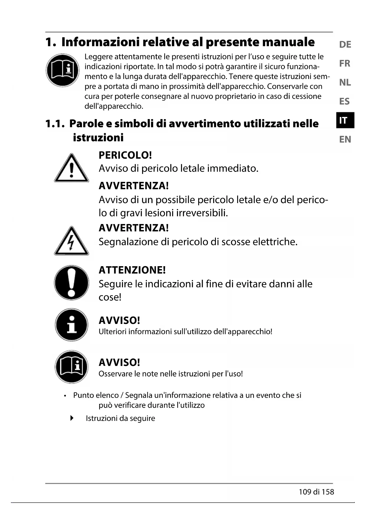 1.1. Parole e simboli di avvertimento utilizzati nelle istruzioni .................. 109