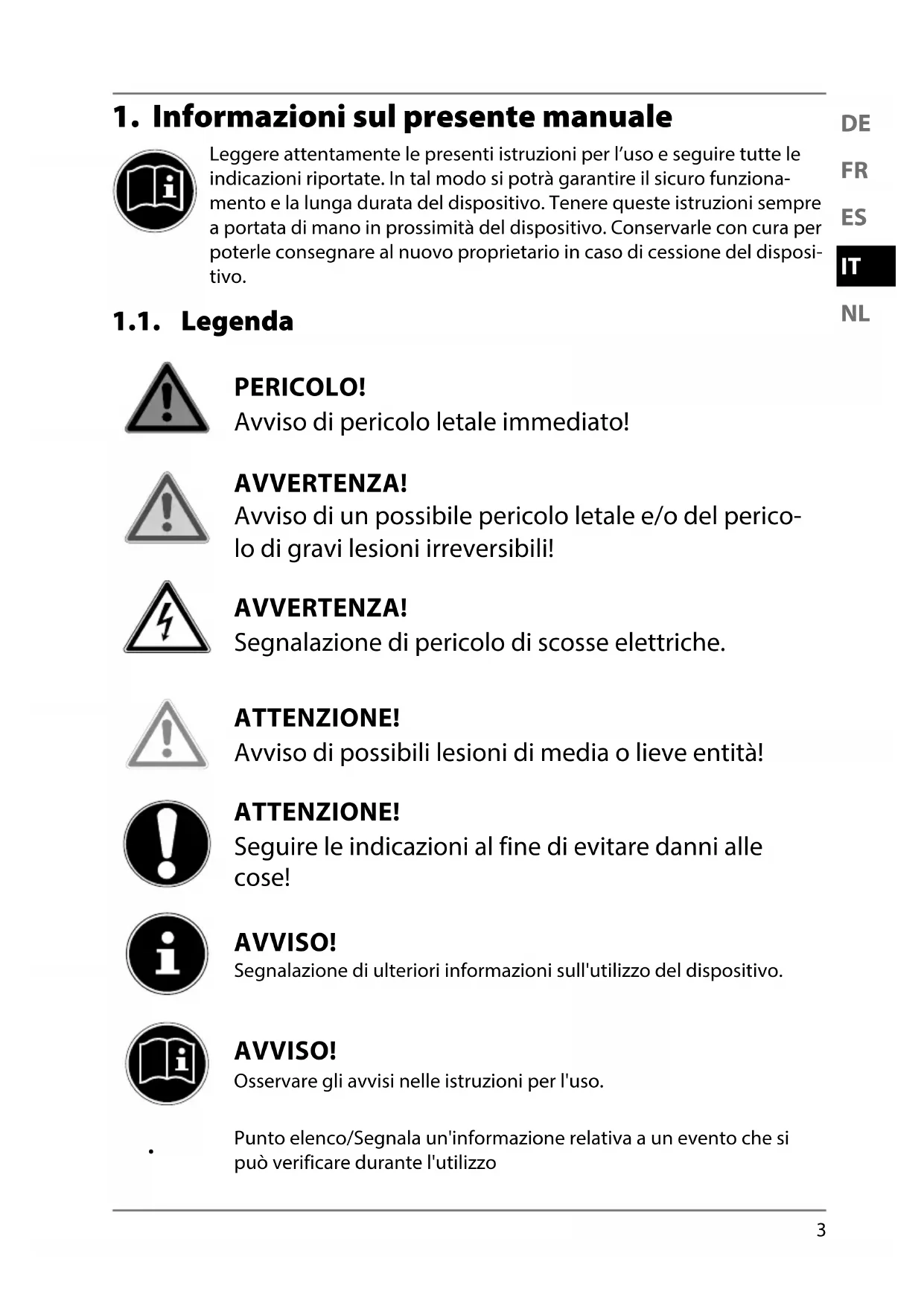 Leggere attentamente le presenti istruzioni per l’uso e seguire tutte le indicazioni riportate. In tal modo si potrà garantire il sicuro funziona- mento e la lunga durata del dispositivo. Tenere queste istruzioni sempre a portata di mano in prossimità del dispositivo. Conservarle con cura per poterle consegnare al nuovo proprietario in caso di cessione del disposi- tivo. 1.1. Legenda PERICOLO! Avviso di pericolo letale immediato! AVVERTENZA! Avviso di un possibile pericolo letale e/o del perico- lo di gravi lesioni irreversibili! AVVERTENZA! Segnalazione di pericolo di scosse elettriche. ATTENZIONE! Avviso di possibili lesioni di media o lieve entità! ATTENZIONE! Seguire le indicazioni al fine di evitare danni alle cose! AVVISO! Segnalazione di ulteriori informazioni sull'utilizzo del dispositivo. AVVISO! Osservare gli avvisi nelle istruzioni per l'uso.