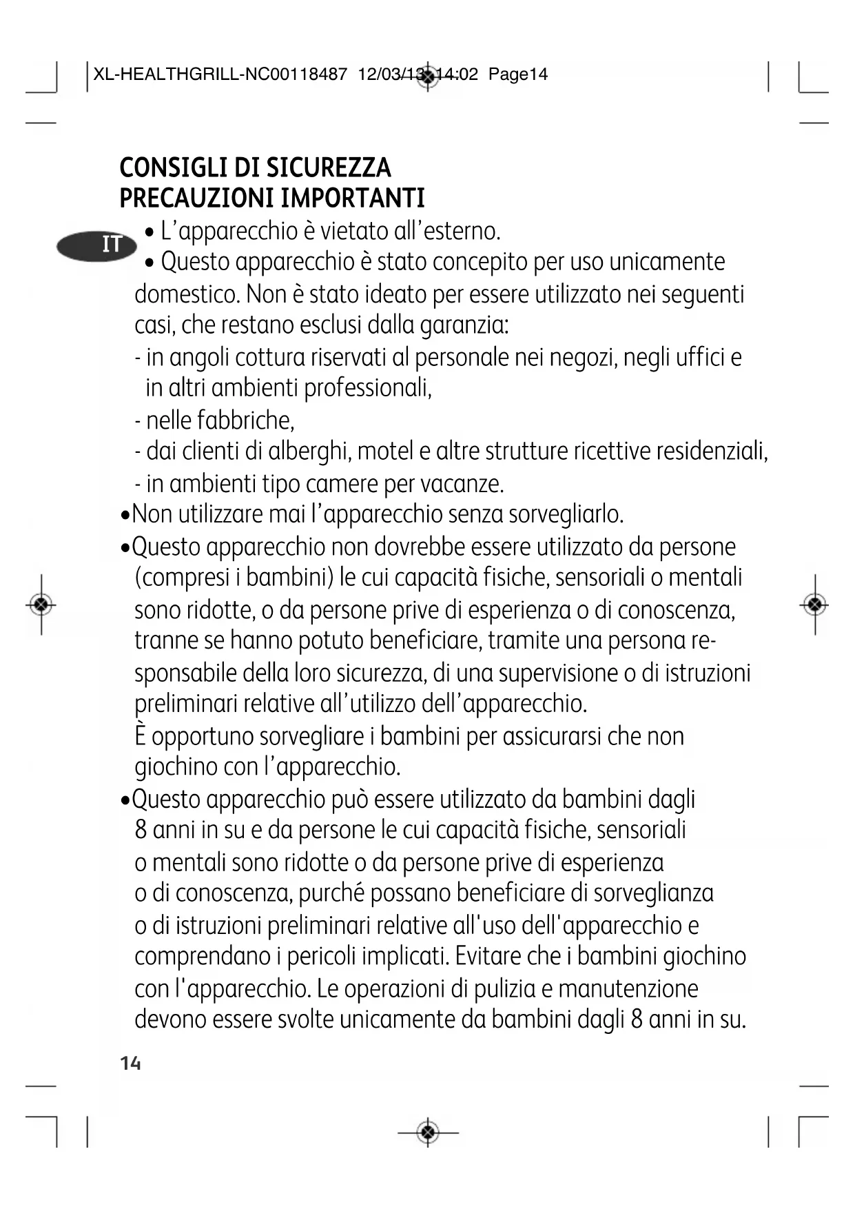 XL-HEALTHGRILL-NC00118487 12/03/13 14:02 Page14Tenere l'apparecchio e il relativo cavo di alimentazione fuori della portata dei bambini di età inferiore agli 8 anni.