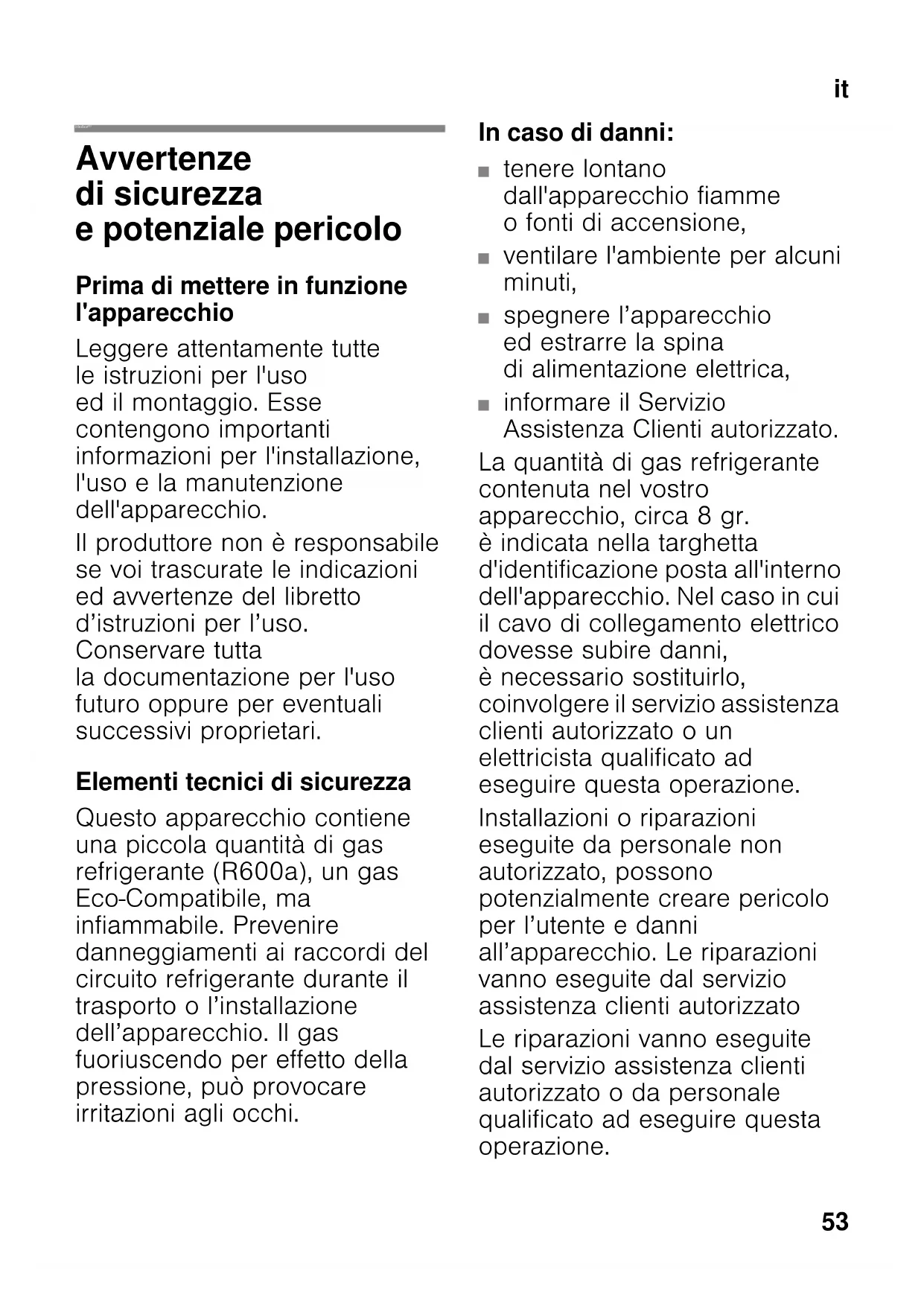 itIndice itIstruzioni per I´uso Avvertenze di sicurezza e potenziale pericolo Prima di mettere in funzione l'apparecchio Leggere attentamente tutte le istruzioni per l'uso ed il montaggio. Esse contengono importanti informazioni per l'installazione, l'uso e la manutenzione dell'apparecchio. Il produttore non è responsabile se voi trascurate le indicazioni ed avvertenze del libretto d’istruzioni per l’uso. Conservare tutta la documentazione per l'uso futuro oppure per eventuali successivi proprietari. Elementi tecnici di sicurezza Questo apparecchio contiene una piccola quantità di gas refrigerante (R600a), un gas Eco-Compatibile, ma infiammabile. Prevenire danneggiamenti ai raccordi del circuito refrigerante durante il trasporto o l’installazione dell’apparecchio. Il gas fuoriuscendo per effetto della pressione, può provocare irritazioni agli occhi. In caso di danni: ■ tenere lontano dall'apparecchio fiamme o fonti di accensione, ■ ventilare l'ambiente per alcuni minuti, ■ spegnere l’apparecchio ed estrarre la spina di alimentazione elettrica, ■ informare il Servizio Assistenza Clienti autorizzato. La quantità di gas refrigerante contenuta nel vostro apparecchio, circa 8 gr. è indicata nella targhetta d'identificazione posta all'interno dell'apparecchio. Nel caso in cui il cavo di collegamento elettrico dovesse subire danni, è necessario sostituirlo, coinvolgere il servizio assistenza clienti autorizzato o un elettricista qualificato ad eseguire questa operazione. Installazioni o riparazioni eseguite da personale non autorizzato, possono potenzialmente creare pericolo per l’utente e danni all’apparecchio. Le riparazioni vanno eseguite dal servizio assistenza clienti autorizzato Le riparazioni vanno eseguite dal servizio assistenza clienti autorizzato o da personale qualificato ad eseguire questa operazione.it