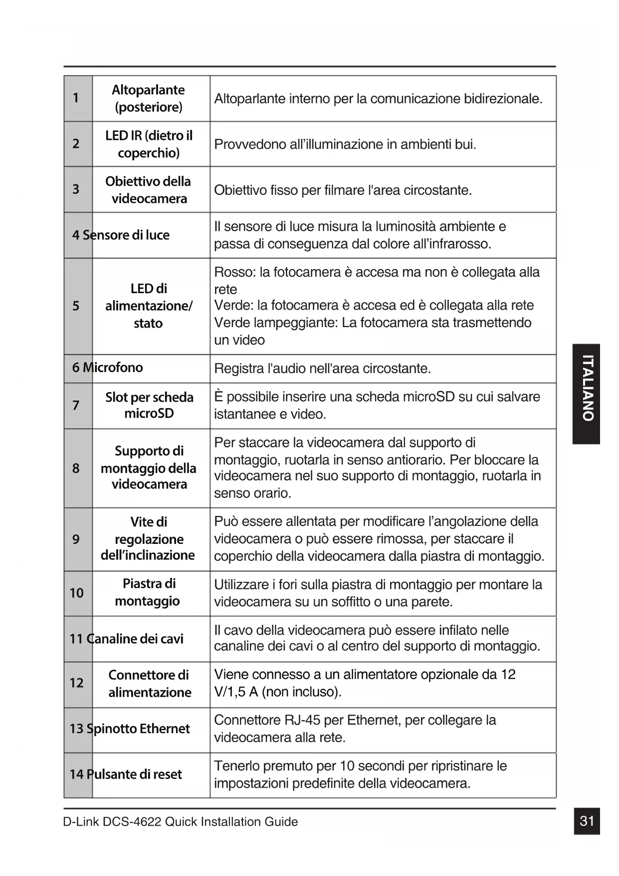Connettore di alimentazione Viene connesso a un alimentatore opzionale da 12 V/1,5 A (non incluso). 13 Spinotto Ethernet Connettore RJ-45 per Ethernet, per collegare la videocamera alla rete. 14 Pulsante di reset Tenerlo premuto per 10 secondi per ripristinare le impostazioni predefinite della videocamera.D-Link DCS-4622 Quick Installation Guide