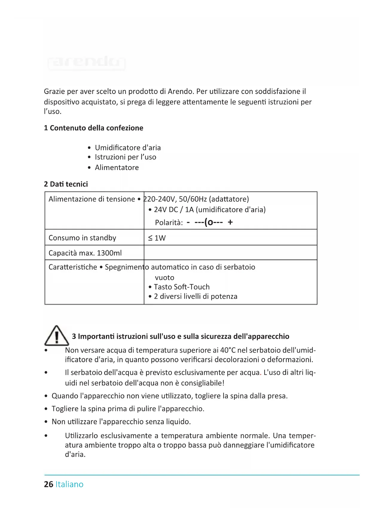 Grazie per aver scelto un prodotto di Arendo. Perutilizzare con soddisfazione il dispositivo acquistato, si prega di leggere attendamente le seguenti istruzioni per l'uso.
