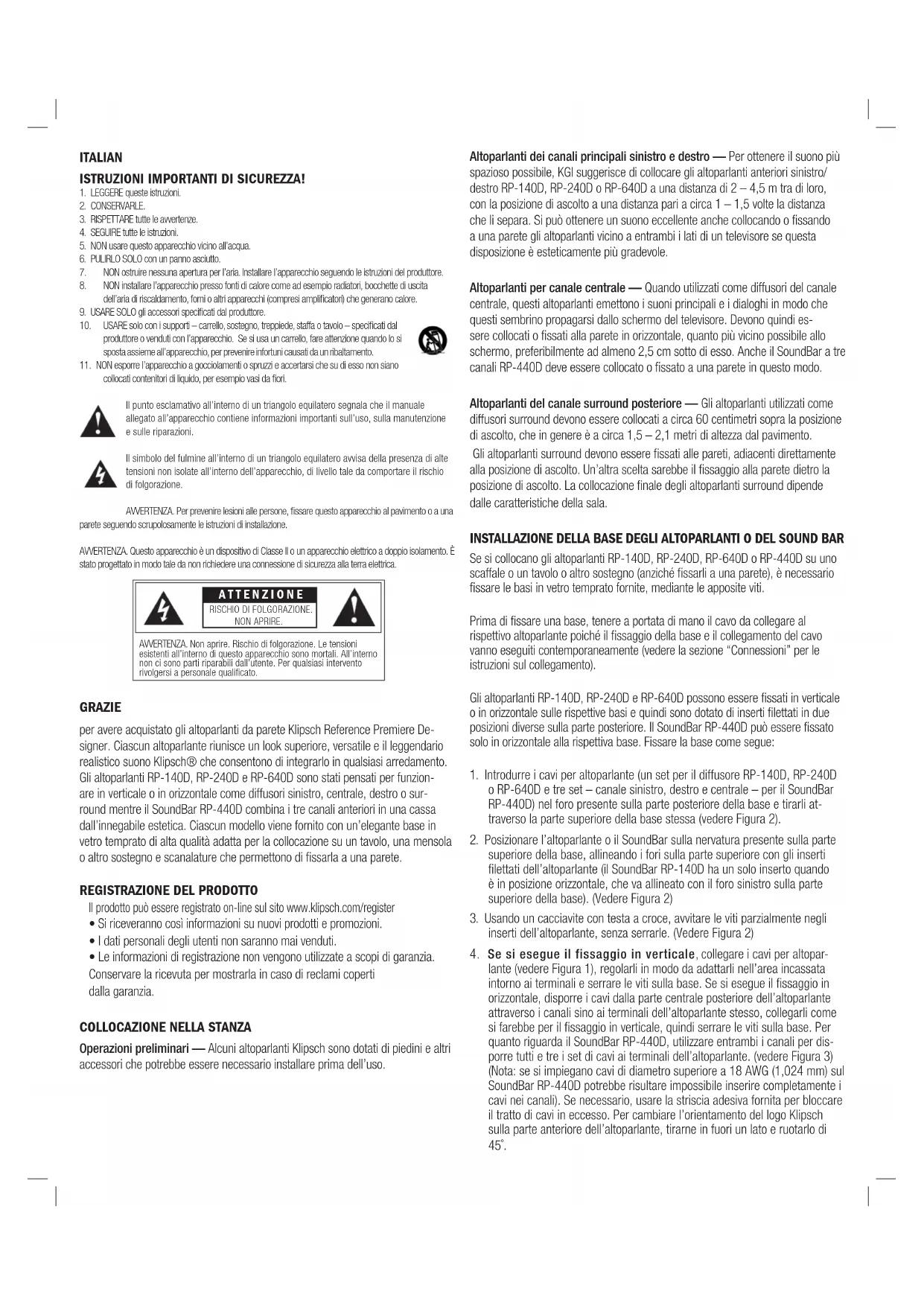 lante (vedere Figura 1), regolarli in modo da adattarli nell’area incassata intorno ai terminali e serrare le viti sulla base. Se si esegue il fissaggio in orizzontale, disporre i cavi dalla parte centrale posteriore dell’altoparlante attraverso i canali sino ai terminali dell’altoparlante stesso, collegarli come si farebbe per il fissaggio in verticale, quindi serrare le viti sulla base. Per quanto riguarda il SoundBar RP-440D, utilizzare entrambi i canali per dis- porre tutti e tre i set di cavi ai terminali dell’altoparlante. (vedere Figura 3) (Nota: se si impiegano cavi di diametro superiore a 18 AWG (1,024 mm) sul SoundBar RP-440D potrebbe risultare impossibile inserire completamente i cavi nei canali). Se necessario, usare la striscia adesiva fornita per bloccare il tratto di cavi in eccesso. Per cambiare l’orientamento del logo Klipsch sulla parte anteriore dell’altoparlante, tirarne in fuori un lato e ruotarlo di 45˚. CAUTION RISK OF ELECTRIC SHOCK. DO NOT OPEN. AVVERTENZA. Non aprire. Rischio di folgorazione. Le tensioni esistenti all’interno di questo apparecchio sono mortali. All’interno non ci sono parti riparabili dall’utente. Per qualsiasi intervento rivolgersi a personale qualificato. C A U T I O N RISK OF ELECTRIC SHOCK. EnglishFrenchSpanishGermanPortugueseSimplified ChineseItalianArabic DO NOT OPEN. ATTENZIONE RISCHIO DI FOLGORAZIONE. NON APRIRE.