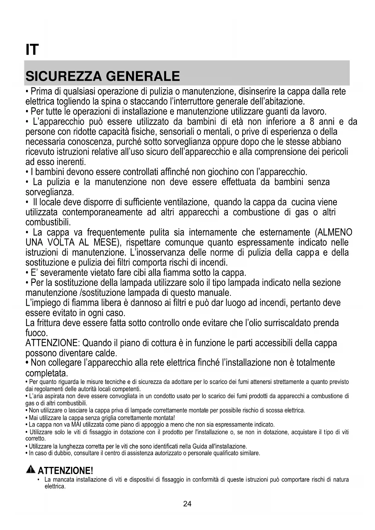 - Non utilizzare o lasciare la cappa priva di lampade correttamente montate per possibile rischio di scossa elettrica.