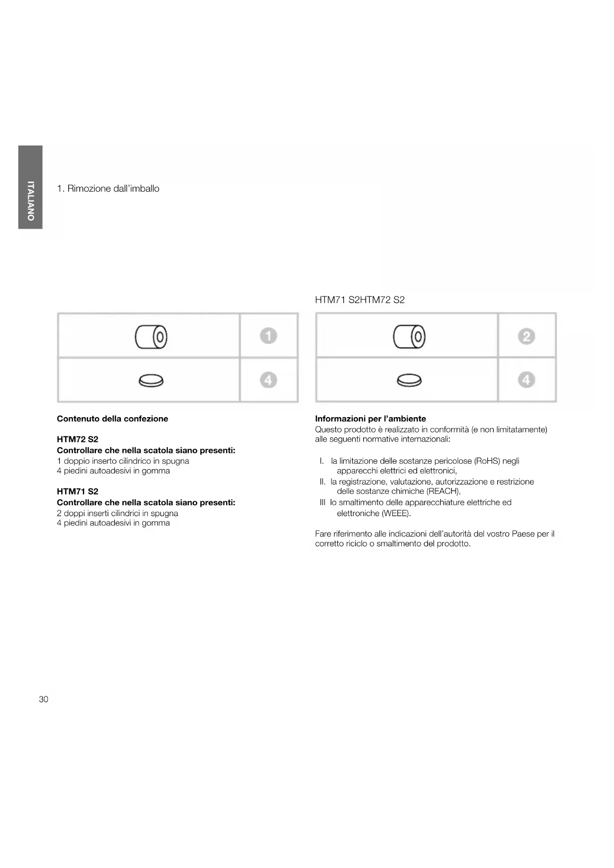 Contenuto della confezione HTM72S2 Controllare che nella scatola siano presenti: 1 doppio inserto cilindrico in spugna 4 piedini autoadesivi in gomma HTM71S2 Controllare che nella scatola siano presenti: 2 doppi inserti cilindrici in spugna 4 piedini autoadesivi in gomma Informazioni per l’ambiente Questo prodotto è realizzato in conformità (e non limitatamente) alle seguenti normative internazionali: