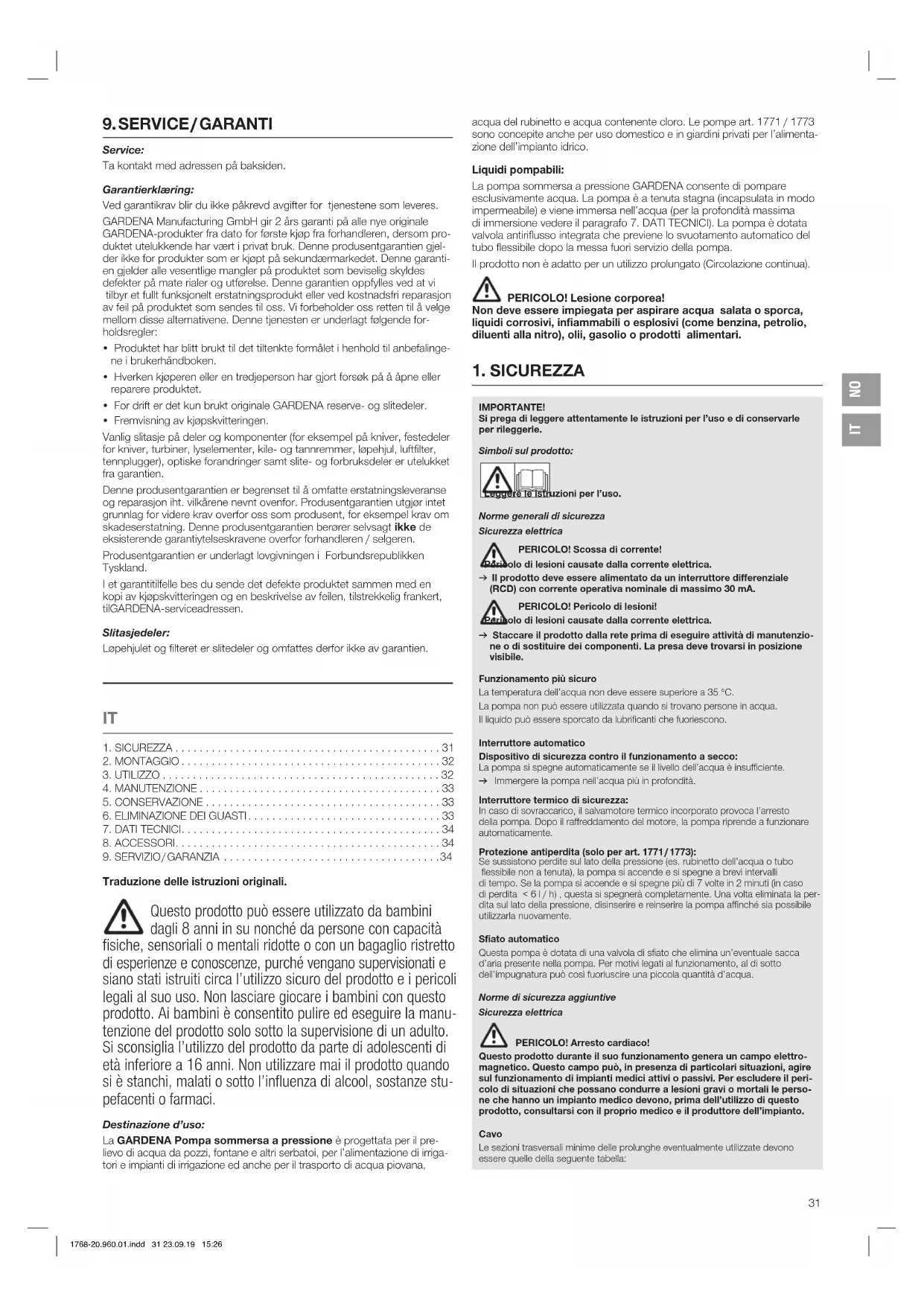 Traduzione delle istruzioni originali. Questo prodotto può essere utilizzato da bambini dagli 8 anni in su nonché da persone con capacità fisiche, sensoriali o mentali ridotte o con un bagaglio ristretto di esperienze e conoscenze, purché vengano supervisionati e siano stati istruiti circa l’utilizzo sicuro del prodotto e i pericoli legali al suo uso. Non lasciare giocare i bambini con questo prodotto. Ai bambini è consentito pulire ed eseguire la manu- tenzione del prodotto solo sotto la supervisione di un adulto. Si sconsiglia l’utilizzo del prodotto da parte di adolescenti di età inferiore a 16 anni. Non utilizzare mai il prodotto quando si è stanchi, malati o sotto l’influenza di alcool, sostanze stu- pefacenti o farmaci. Destinazione d’uso: La GARDENA Pompa sommersa a pressione è progettata per il pre- lievo di acqua da pozzi, fontane e altri serbatoi, per l’alimentazione di irriga- tori e impianti di irrigazione ed anche per il trasporto di acqua piovana, IMPORTANTE! Si prega di leggere attentamente le istruzioni per l’uso e di conservarle per rileggerle. Simboli sul prodotto: Leggere le istruzioni per l’uso. Norme generali di sicurezza Sicurezza elettrica PERICOLO! Scossa di corrente! Pericolo di lesioni causate dalla corrente elettrica. v Il prodotto deve essere alimentato da un interruttore differenziale (RCD) con corrente operativa nominale di massimo 30 mA. PERICOLO! Pericolo di lesioni! Pericolo di lesioni causate dalla corrente elettrica. v Staccare il prodotto dalla rete prima di eseguire attività di manutenzio- ne o di sostituire dei componenti. La presa deve trovarsi in posizione visibile. Funzionamento più sicuro La temperatura dell’acqua non deve essere superiore a 35 °C. La pompa non può essere utilizzata quando si trovano persone in acqua. Il liquido può essere sporcato da lubrificanti che fuoriescono. Interruttore automatico Dispositivo di sicurezza contro il funzionamento a secco: La pompa si spegne automaticamente se il livello dell’acqua è insufficiente. v Immergere la pompa nell’acqua più in profondità. Interruttore termico di sicurezza: In caso di sovraccarico, il salvamotore termico incorporato provoca l’arresto della pompa. Dopo il raffreddamento del motore, la pompa riprende a funzionare automaticamente. Protezione antiperdita (solo per art. 1771 / 1773): Se sussistono perdite sul lato della pressione (es. rubinetto dell’acqua o tubo flessibile non a tenuta), la pompa si accende e si spegne a brevi intervalli di tempo. Se la pompa si accende e si spegne più di 7 volte in 2 minuti (in caso di perdita < 6 l / h) , questa si spegnerà completamente. Una volta eliminata la per- dita sul lato della pressione, disinserire e reinserire la pompa affinché sia possibile utilizzarla nuovamente. Sfiato automatico Questa pompa è dotata di una valvola di sfiato che elimina un’eventuale sacca d’aria presente nella pompa. Per motivi legati al funzionamento, al di sotto dell’impugnatura può così fuoriuscire una piccola quantità d’acqua. Norme di sicurezza aggiuntive Sicurezza elettrica PERICOLO! Arresto cardiaco! Questo prodotto durante il suo funzionamento genera un campo elettro- magnetico. Questo campo può, in presenza di particolari situazioni, agire sul funzionamento di impianti medici attivi o passivi. Per escludere il peri- colo di situazioni che possano condurre a lesioni gravi o mortali le perso- ne che hanno un impianto medico devono, prima dell’utilizzo di questo prodotto, consultarsi con il proprio medico e il produttore dell’impianto. Cavo Le sezioni trasversali minime delle prolunghe eventualmente utilizzate devono essere quelle della seguente tabella: