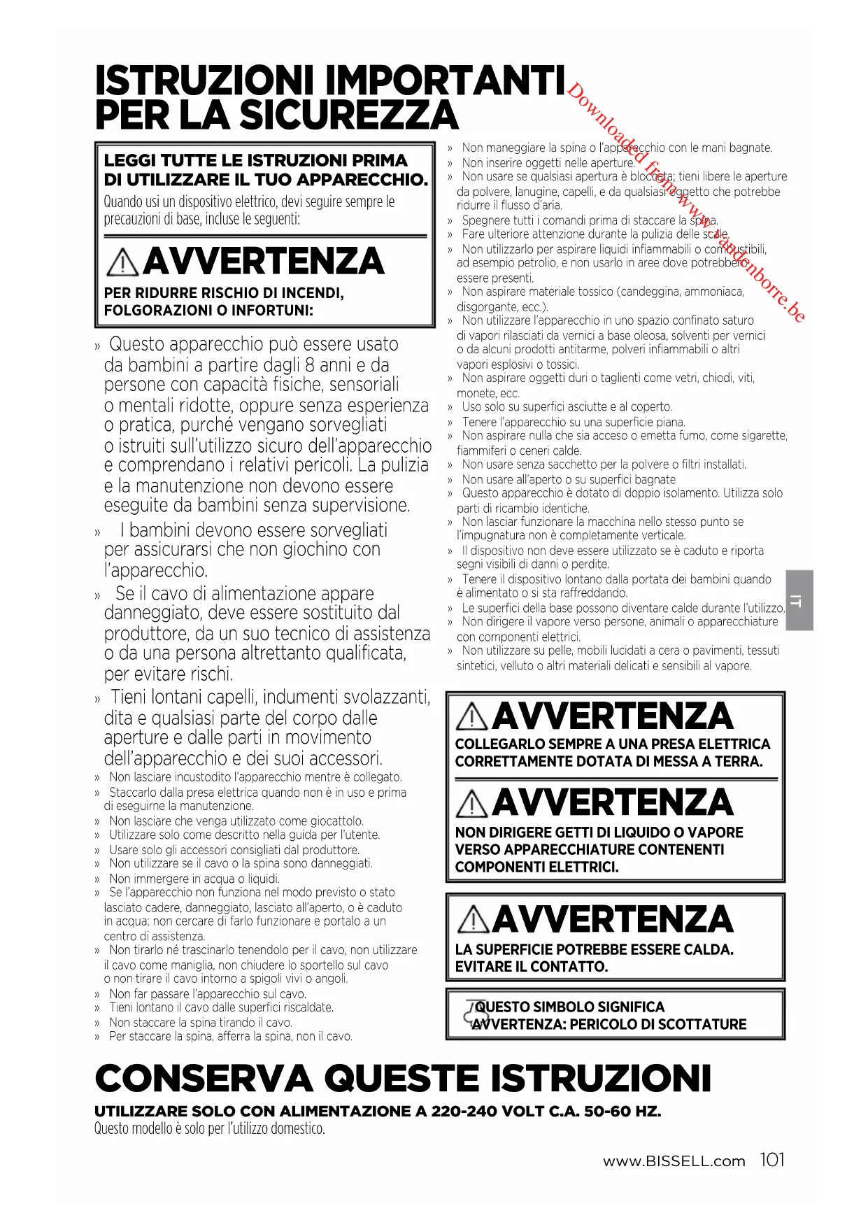 UTILIZZARE SOLO CON ALIMENTAZIONE A 220-240 VOLT C.A. 50-60 HZ. Questo modello è solo per l’utilizzo domestico. Downloaded from www.vandenborre.beIT www.BISSELL.com