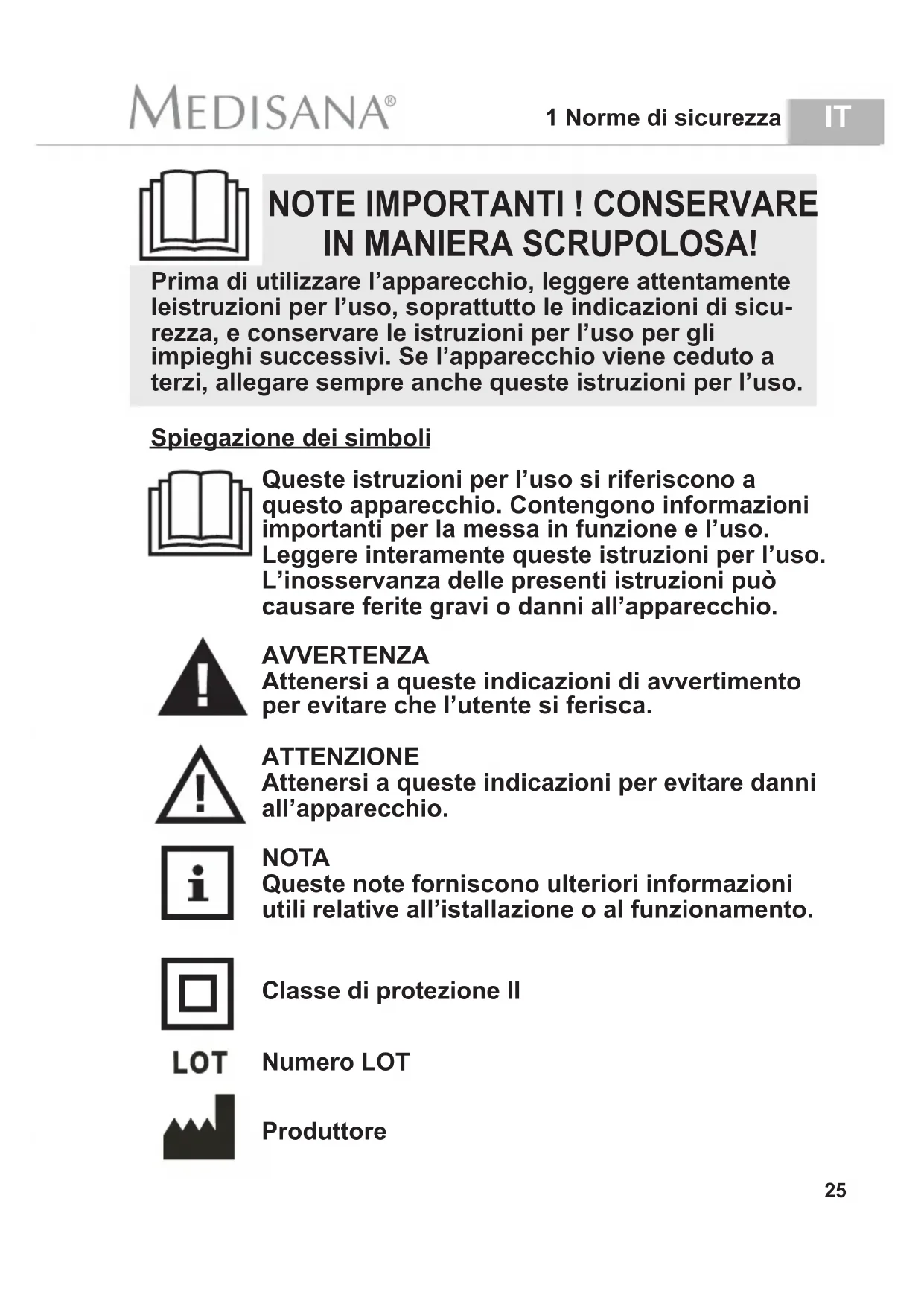 IN MANIERA SCRUPOLOSA! Queste istruzioni per l’uso si riferiscono a questo apparecchio. Contengono informazioni importanti per la messa in funzione e l’uso. Leggere interamente queste istruzioni per l’uso. L’inosservanza delle presenti istruzioni può causare ferite gravi o danni all’apparecchio. AVVERTENZA Attenersi a queste indicazioni di avvertimento per evitare che l’utente si ferisca. ATTENZIONE Attenersi a queste indicazioni per evitare danni all’apparecchio. NOTA Queste note forniscono ulteriori informazioni utili relative all’istallazione o al funzionamento. Classe di protezione II Spiegazione dei simboli Numero LOT Produttore Prima di utilizzare l’apparecchio, leggere attentamente leistruzioni per l’uso, soprattutto le indicazioni di sicu- rezza, e conservare le istruzioni per l’uso per gli impieghi successivi. Se l’apparecchio viene ceduto a terzi, allegare sempre anche queste istruzioni per l’uso. 25• Prima di collegare l'apparecchio all'alimentazione di corrente, accertarsi che la tensione di rete indicata sulla targhetta corrisponda a quella della rete di alimentazione. Tenere lontano il cavo di alimentazione e l’apparecchio da fonti di calore, da superfici calde, dall’umidità e dall’acqua o altri liquidi. Non toccare mai la spina o l’interruttore con le mani bagnate o umide o quando ci si trova nella vasca da bagno o nella doccia. Non recuperare l’apparecchio se cade in acqua. Staccare immediatamente la spina. Collegare l’unità in modo che il cavo d’alimentazione sia facilmente accessibile. Spegnere sempre l'apparecchio dopo l'utilizzo tramite i tasti di comando e togliere la spina dalla presa. Per scollegare l'apparecchio dall'alimentazione di corrente, non tirare mai il cavo di alimentazione, bensì la spina di rete! Non trasportare, tirare o ruotare l’apparecchio afferrandolo dal cavo di alimentazione. Se il cavo di alimentazione è danneggiato, potrà essere sostituito esclusivamente da MEDISANA, dal suo servizio di distributore specializzato autorizzato o da una persona debitamente qualificata per evitare eventuali pericoli. Accertarsi che i cavi di collegamento siano posizionati in modo che non vi si possa inciampare. Non devono essere piegati, serrati o attorcigliati.