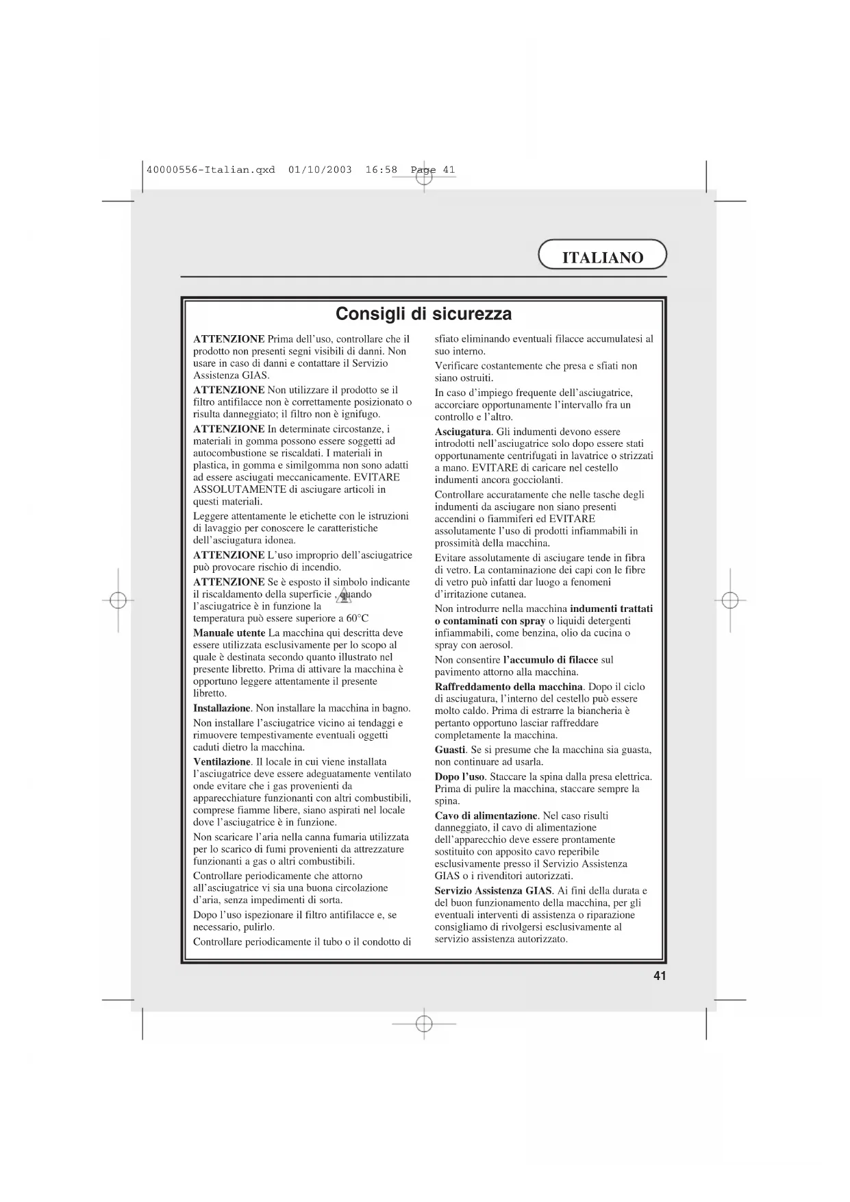 Chaussée de Haecht 1650 BRUXELLES 1130 Durée de la garantie : 12 mois à compter de la date d’achat. Si l’appareil est utilisé pour du nettoyage industriel (linge ou locaux d’entreprise par exemple), la garantie est réduite à 6 mois. Preuve à fournir pour bénéficier de la garantie : Preuve de la date d’achat. Cachet commercial du vendeur et date de la vente sur emplacement réservé sur le carton d’emballage ou facture d’achat, ticket de caisse détaillé. Portée de la garantie : Défaut de matière première, vice de fabrication et de fonctionnement. Réparations sous garantie : Elles sont effectuées uniquement par des Stations Service agréés HOOVER. Toute réparation effectuée en vertu de la présente garantie le sera aux conditions suivantes : Pièces de rechange gratuites Main d’œuvre gratuite Frais de déplacement : A la charge de l’acheteur Port, y compris emballage et frais postaux : A la charge de l’acheteur et à ses risques. Limites de la garantie : Sont exclues de la garantie les pièces à remplacer suite à une usure normale, telles que : flexibles et brosses non électriques, allonges, brosses, courroies, filtres, sacs papier et diffuseurs de parfum. La garantie est uniquement appliquée quand : l’installation de l’appareil est conforme aux normes électriques et techniques en vigueur dans le pays où il est utilisé. l’appareil est installé et utilisé suivant les normes définies dans le manuel d’utilisation HOOVER. La garantie ne sera pas appliquée quand : l’appareil aura été réparé, entretenu, modifié ou démonté par une personne non agréée par la Société HOOVER ou la réparation est imputable à un défaut d’installation ou consécutive à l’utilisation de pièces autres que d’origine HOOVER. Pour obtenir les coordonnées des Stations Service agréées HOOVER FRANCE : (réparation, sacs papier, accessoires, produits d’entretien) Mintel 3615 code HOOVER Courrier à l’adresse ci-dessus Service Consommateurs (adresse ci- dessus) Pour le Bénélux, écrivez à l’adresse ci- dessus. French guarantee.fm Page 40 Wednesday, October 1, 2003 3:30 PM41 ITALIANO Consigli di sicurezza ATTENZIONE Prima dell’uso, controllare che il prodotto non presenti segni visibili di danni. Non usare in caso di danni e contattare il Servizio Assistenza GIAS. ATTENZIONE Non utilizzare il prodotto se il filtro antifilacce non è correttamente posizionato o risulta danneggiato; il filtro non è ignifugo. ATTENZIONE In determinate circostanze, i materiali in gomma possono essere soggetti ad autocombustione se riscaldati. I materiali in plastica, in gomma e similgomma non sono adatti ad essere asciugati meccanicamente. EVITARE ASSOLUTAMENTE di asciugare articoli in questi materiali. Leggere attentamente le etichette con le istruzioni di lavaggio per conoscere le caratteristiche dell’asciugatura idonea. ATTENZIONE L’uso improprio dell’asciugatrice può provocare rischio di incendio. ATTENZIONE Se è esposto il simbolo indicante il riscaldamento della superficie , quando l’asciugatrice è in funzione la temperatura può essere superiore a 60°C Manuale utente La macchina qui descritta deve essere utilizzata esclusivamente per lo scopo al quale è destinata secondo quanto illustrato nel presente libretto. Prima di attivare la macchina è opportuno leggere attentamente il presente libretto. Installazione. Non installare la macchina in bagno. Non installare l’asciugatrice vicino ai tendaggi e rimuovere tempestivamente eventuali oggetti caduti dietro la macchina. Ventilazione. Il locale in cui viene installata l’asciugatrice deve essere adeguatamente ventilato onde evitare che i gas provenienti da apparecchiature funzionanti con altri combustibili, comprese fiamme libere, siano aspirati nel locale dove l’asciugatrice è in funzione. Non scaricare l’aria nella canna fumaria utilizzata per lo scarico di fumi provenienti da attrezzature funzionanti a gas o altri combustibili. Controllare periodicamente che attorno all’asciugatrice vi sia una buona circolazione d’aria, senza impedimenti di sorta. Dopo l’uso ispezionare il filtro antifilacce e, se necessario, pulirlo. Controllare periodicamente il tubo o il condotto di sfiato eliminando eventuali filacce accumulatesi al suo interno. Verificare costantemente che presa e sfiati non siano ostruiti. In caso d’impiego frequente dell’asciugatrice, accorciare opportunamente l’intervallo fra un controllo e l’altro. Asciugatura. Gli indumenti devono essere introdotti nell’asciugatrice solo dopo essere stati opportunamente centrifugati in lavatrice o strizzati a mano. EVITARE di caricare nel cestello indumenti ancora gocciolanti. Controllare accuratamente che nelle tasche degli indumenti da asciugare non siano presenti accendini o fiammiferi ed EVITARE assolutamente l’uso di prodotti infiammabili in prossimità della macchina. Evitare assolutamente di asciugare tende in fibra di vetro. La contaminazione dei capi con le fibre di vetro può infatti dar luogo a fenomeni d’irritazione cutanea. Non introdurre nella macchina indumenti trattati o contaminati con spray o liquidi detergenti infiammabili, come benzina, olio da cucina o spray con aerosol. Non consentire l’accumulo di filacce sul pavimento attorno alla macchina. Raffreddamento della macchina. Dopo il ciclo di asciugatura, l’interno del cestello può essere molto caldo. Prima di estrarre la biancheria è pertanto opportuno lasciar raffreddare completamente la macchina. Guasti. Se si presume che la macchina sia guasta, non continuare ad usarla. Dopo l’uso. Staccare la spina dalla presa elettrica. Prima di pulire la macchina, staccare sempre la spina. Cavo di alimentazione. Nel caso risulti danneggiato, il cavo di alimentazione dell’apparecchio deve essere prontamente sostituito con apposito cavo reperibile esclusivamente presso il Servizio Assistenza GIAS o i rivenditori autorizzati. Servizio Assistenza GIAS.