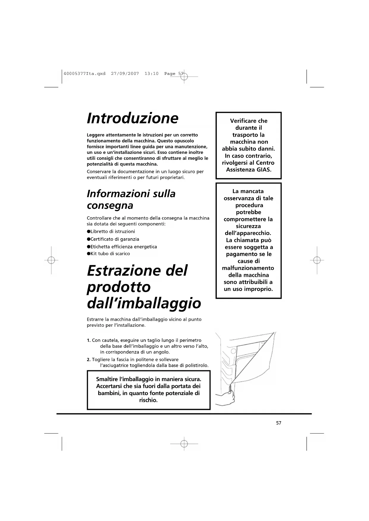 40005377Ita.qxd 27/09/2007 13:10 Page 56Introduzione Leggere attentamente le istruzioni per un corretto funzionamento della macchina. Questo opuscolo fornisce importanti linee guida per una manutenzione, un uso e un'installazione sicuri. Esso contiene inoltre utili consigli che consentiranno di sfruttare al meglio le potenzialità di questa macchina. Conservare la documentazione in un luogo sicuro per eventuali riferimenti o per futuri proprietari. Informazioni sulla consegna Controllare che al momento della consegna la macchina sia dotata dei seguenti componenti: ● Libretto di istruzioni ● Certificato di garanzia ● Etichetta efficienza energetica ● Kit tubo di scarico Estrarre la macchina dall’imballaggio vicino al punto previsto per l’installazione.