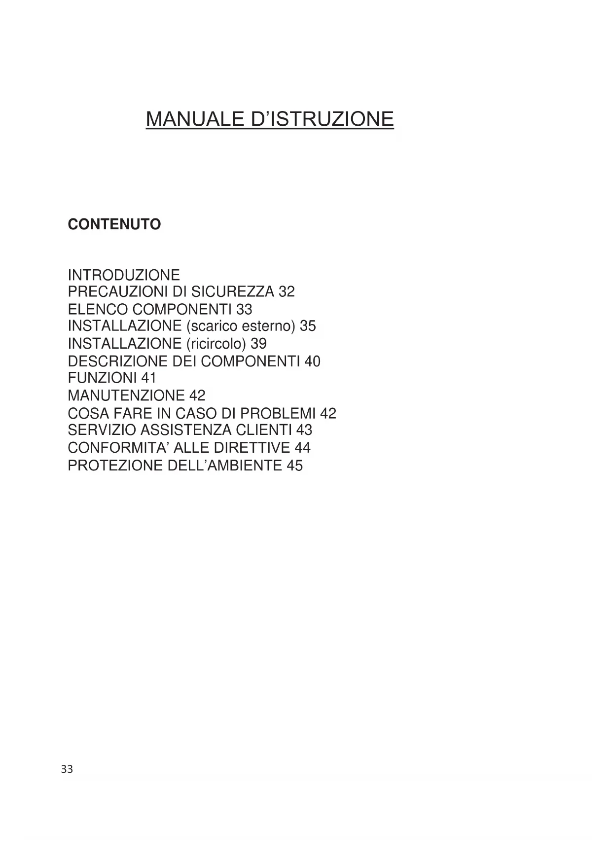 ELENCO COMPONENTI 33 INSTALLAZIONE (scarico esterno) 35 INSTALLAZIONE (ricircolo) 39