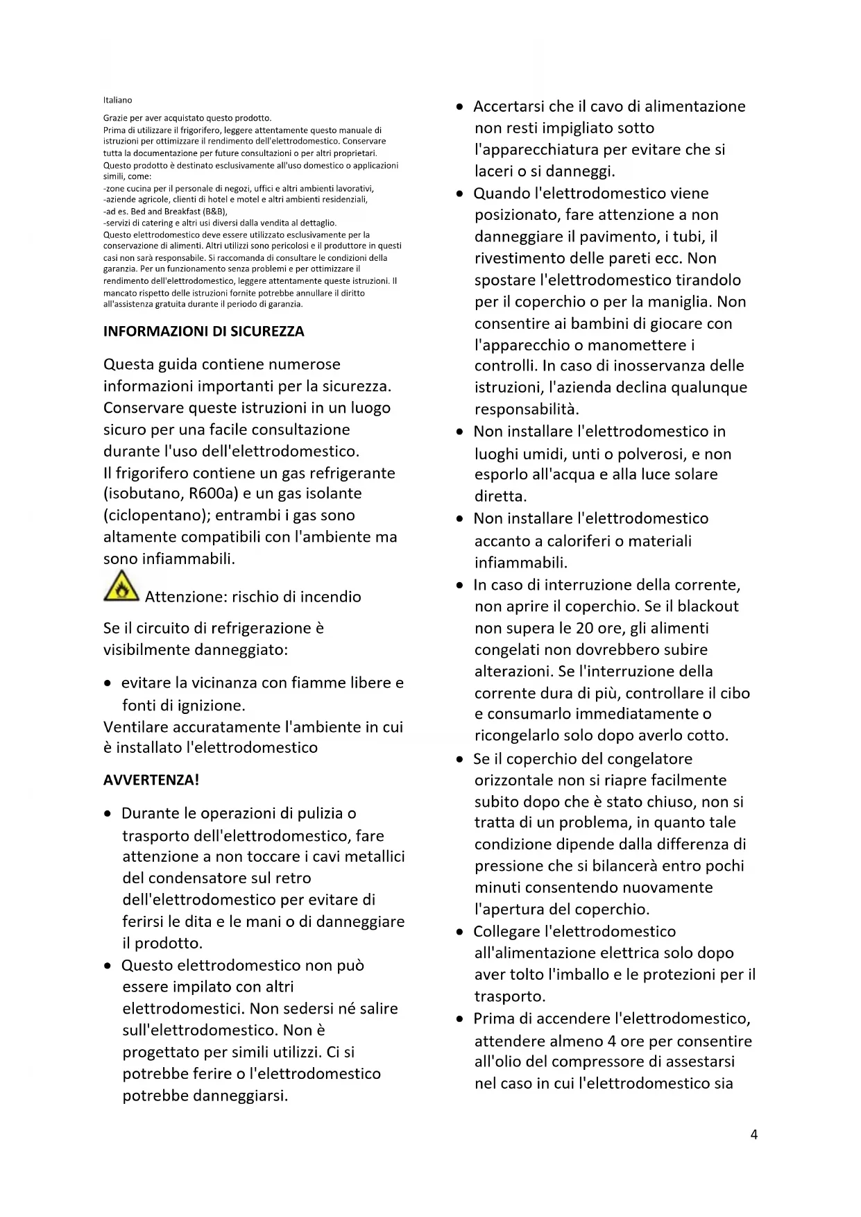 Questa guida contiene numerose informazioni importanti per la sicurezza. Conservare queste istruzioni in un luogo sicuro per una facile consultazione durante l'uso dell'elettrodomestico. Il frigorifero contiene un gas refrigerante (isobutano, R600a) e un gas isolante (ciclopentano); entrambi i gas sono altamente compatibili con l'ambiente ma sono infiammabili. Attenzione: rischio di incendio Se il circuito di refrigerazione è visibilmente danneggiato: