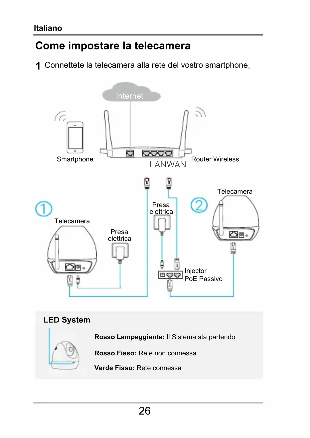 LANWAN LED System Rosso Lampeggiante: Il Sistema sta partendoRosso Fisso: Rete non connessaVerde Fisso: Rete connessa Internet Injector PoE Passivo Telecamera TelecameraRouter WirelessSmartphonePresaelettricaPresaelettricaItaliano