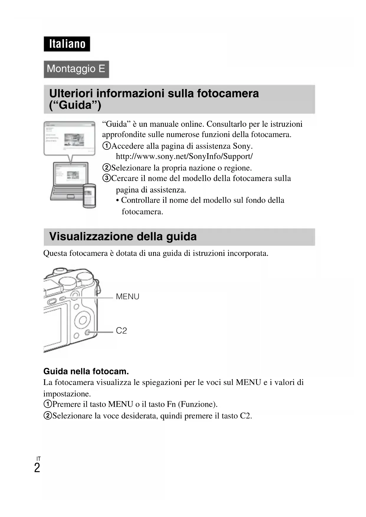 Questa fotocamera è dotata di una guida di istruzioni incorporata. Guida nella fotocam. La fotocamera visualizza le spiegazioni per le voci sul MENU e i valori di impostazione. 1 Premere il tasto MENU o il tasto Fn (Funzione). 2 Selezionare la voce desiderata, quindi premere il tasto C2. Italiano Montaggio E Ulteriori informazioni sulla fotocamera (“Guida”) “Guida” è un manuale online. Consultarlo per le istruzioni approfondite sulle numerose funzioni della fotocamera. 1 Accedere alla pagina di assistenza Sony. http://www.sony.net/SonyInfo/Support/ 2 Selezionare la propria nazione o regione. 3 Cercare il nome del modello della fotocamera sulla pagina di assistenza.