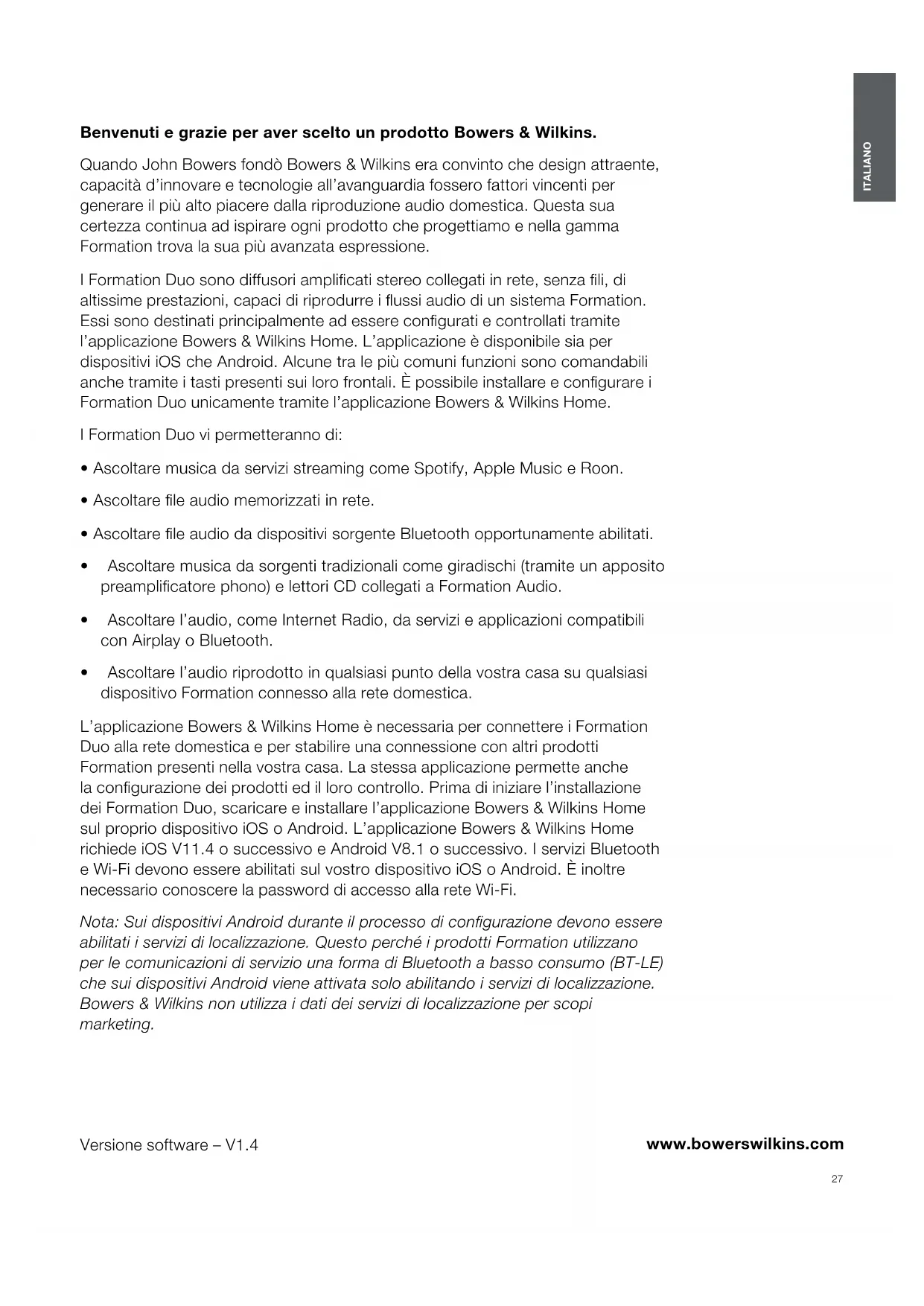 - Ascoltare l’audio riprodotto in qualsiasi punto della vostra casa su qualsiasi dispositivo Formation connesso alla rete domestica. L’applicazione Bowers & Wilkins Home è necessaria per connettere i Formation Duo alla rete domestica e per stabilire una connessione con altri prodotti Formation presenti nella vostra casa. La stessa applicazione permette anche la congurazione dei prodotti ed il loro controllo. Prima di iniziare l’installazione dei Formation Duo, scaricare e installare l’applicazione Bowers & Wilkins Home sul proprio dispositivo iOS o Android. L’applicazione Bowers & Wilkins Home richiede iOS V11.4 o successivo e Android V8.1 o successivo. I servizi Bluetooth e Wi-Fi devono essere abilitati sul vostro dispositivo iOS o Android. È inoltre necessario conoscere la password di accesso alla rete Wi-Fi. Nota: Sui dispositivi Android durante il processo di congurazione devono essere abilitati i servizi di localizzazione. Questo perché i prodotti Formation utilizzano per le comunicazioni di servizio una forma di Bluetooth a basso consumo (BT-LE) che sui dispositivi Android viene attivata solo abilitando i servizi di localizzazione. Bowers & Wilkins non utilizza i dati dei servizi di localizzazione per scopi marketing. Versione software – V1.4 ITALIANO Contents ITALIANO 1