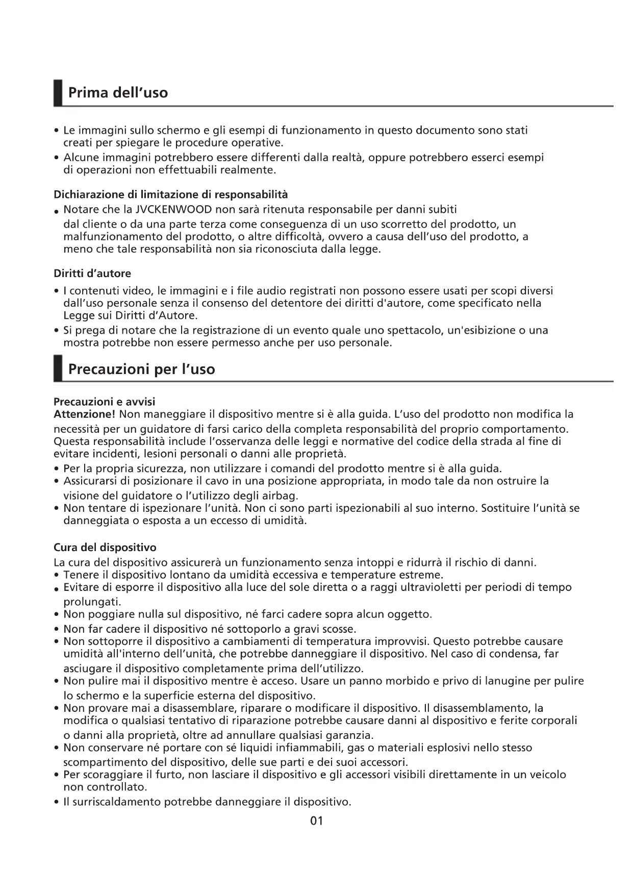 Prima dell’uso Le immagini sullo schermo e gli esempi di funzionamento in questo documento sono stati creati per spiegare le procedure operative. Alcune immagini potrebbero essere differenti dalla realtà, oppure potrebbero esserci esempi di operazioni non effettuabili realmente. Notare che la JVCKENWOOD non sarà ritenuta responsabile per danni subiti dal cliente o da una parte terza come conseguenza di un uso scorretto del prodotto, un malfunzionamento del prodotto, o altre difficoltà, ovvero a causa dell’uso del prodotto, a meno che tale responsabilità non sia riconosciuta dalla legge. I contenuti video, le immagini e i file audio registrati non possono essere usati per scopi diversi dall’uso personale senza il consenso del detentore dei diritti d'autore, come specificato nella Legge sui Diritti d’Autore. Si prega di notare che la registrazione di un evento quale uno spettacolo, un'esibizione o una mostra potrebbe non essere permesso anche per uso personale.