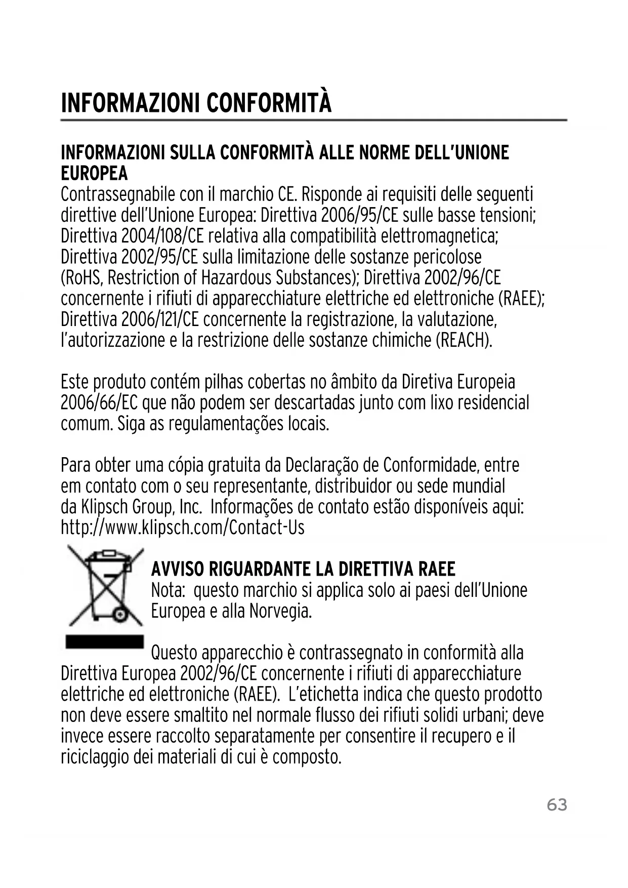 Nota: questo marchio si applica solo ai paesi dell’Unione Europea e alla Norvegia. Questo apparecchio è contrassegnato in conformità alla Direttiva Europea 2002/96/CE concernente i rifiuti di apparecchiature elettriche ed elettroniche (RAEE). L’etichetta indica che questo prodotto non deve essere smaltito nel normale flusso dei rifiuti solidi urbani; deve invece essere raccolto separatamente per consentire il recupero e il riciclaggio dei materiali di cui è composto.64 INFORMAZIONI SULLA CONFORMITÀ ALLE NORME FCC E CANADESI