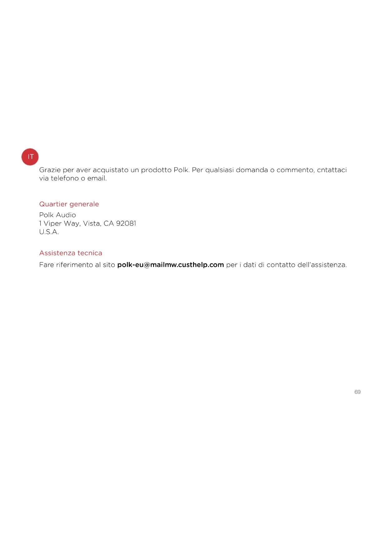 Muto Suonare/Pausa Modalità sportiva Bluetooth® VoiceAdjust su/giù Tasto Action Premilo per abbassare il volume e usare i servizi vocali di Alexa Modalità Notturna Ingresso HDMI Indietro Basso su/giù Ingresso TV HDMI-ARC/Ottico Modalità Filmato Inoltrare Volume principale su/giù Modalità musicale Telecomando77 Modalità di suono Modalità sport Esalta i contenuti ricchi di dialoghi, quali eventi sportivi, notiziari e talk show. Usa la regolazione della voce per migliorare la chiarezza dei dialoghi ed ottimizza i livelli di volume del subwoofer. Modalità notte Riduce i bassi e le dinamiche del volume migliorando la comprensibilità delle voci per ascolti a basso volume. Modalità film Acusticamente ottimizzato per la modalità di suono predefinita è studiata per esaltare i contenuti dei film quanto quelli televisivi. Fornisce anche un potenziamento dei bassi, maggior spazializzazione e Migliora i livelli di regolazione della voce per una migliore chiarezza dei dialoghi. È la modalità predefinita per le fonti HDMI ed ottiche. Modalità musica La modalità musica ore un suono bilanciato e un basso uniforme, riducendo al minimo gli eetti di spazializzazione per garantire una riproduzione sonora più naturale. La modalità stereo garantisce il riempimento sonoro della stanza, replicando i canali anteriori sinistro e destro sui diusori surround sinistro e destro. Utilizza il pulsante Music per passare dalla modalità musica alla modalità stereo durante l’ascolto di audio a 2 canali.78 Ottimizzazione dell’esperienza d’ascolto Regolazione dei dialoghi o del canale centrale Usa la funzione Polk Voice Adjust per regolare i livelli dei dialoghi, per migliorare la nitidezza del suono quando guardi programmi TV, film e sport. Tecnologia Polk VoiceAdjust® integrata La Command Bar presenta dei livelli di voce personalizzabili, che ti permettono di personalizzare la tua esperienza d’ascolto come desideri; in questo modo, potrai ascoltare dei dialoghi chiari e nitidi e non perderti mai una sola parola del tuo film, programma TV o evento sportivo preferito. Regolazione dei bassi Regola facilmente il volume dei bassi, a seconda delle tue preferenze.79 Pannello superiore Sound Bar Pannello posteriore Sound Bar USB Connettore di alimentazione Tasto sincronizzazione Subwoofer Entradas HDMI Entradas HDMI HDMI fuori (ARC) Ottico In Silenziamento microfono Volume - Volume + Tasto Action80 Indicatori visivi La parte frontale della sound bar contiene una luce singola che cambia colore e lampeggia per fornire informazioni sullo stato della sound bar, come le modalità di decoder audio e lo stato di carica.