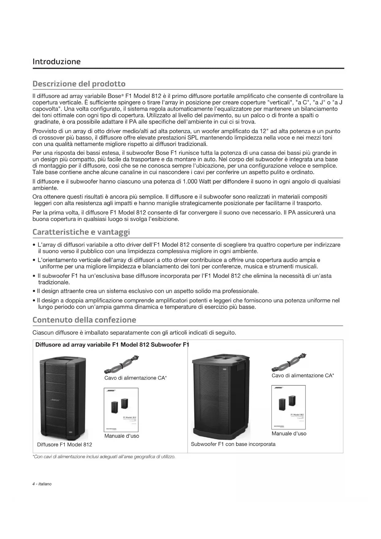 - Il design a doppia amplificazione comprende amplificatori potenti e leggeri che forniscono una potenza uniforme nel lungo periodo con un'ampia gamma dinamica e temperature di esercizio più basse. Contenuto della confezione Ciascun diffusore è imballato separatamente con gli articoli indicati di seguito. Diffusore ad array variabile F1 Model 812 Subwoofer F1 Cavo di alimentazione CA* Manuale d'uso Diffusore F1 Model 812 Cavo di alimentazione CA* Manuale d'uso Subwoofer F1 con base incorporata *Con cavi di alimentazione inclusi adeguati all'area geografica di utilizzo.Italiano - 5 Introduzione Diffusore ad array variabile F1 Model 812 Nota: il diffusore F1 Model 812 viene fornito con inserti filettati M8 per l'ancoraggio o il fissaggio delle staffe per accessori. ATTENZIONE: solo installatori professionisti esperti di tecniche di montaggio sicuro dell'hardware possono tentare di installare un diffusore in posizione elevata. PARTE SUPERIORE