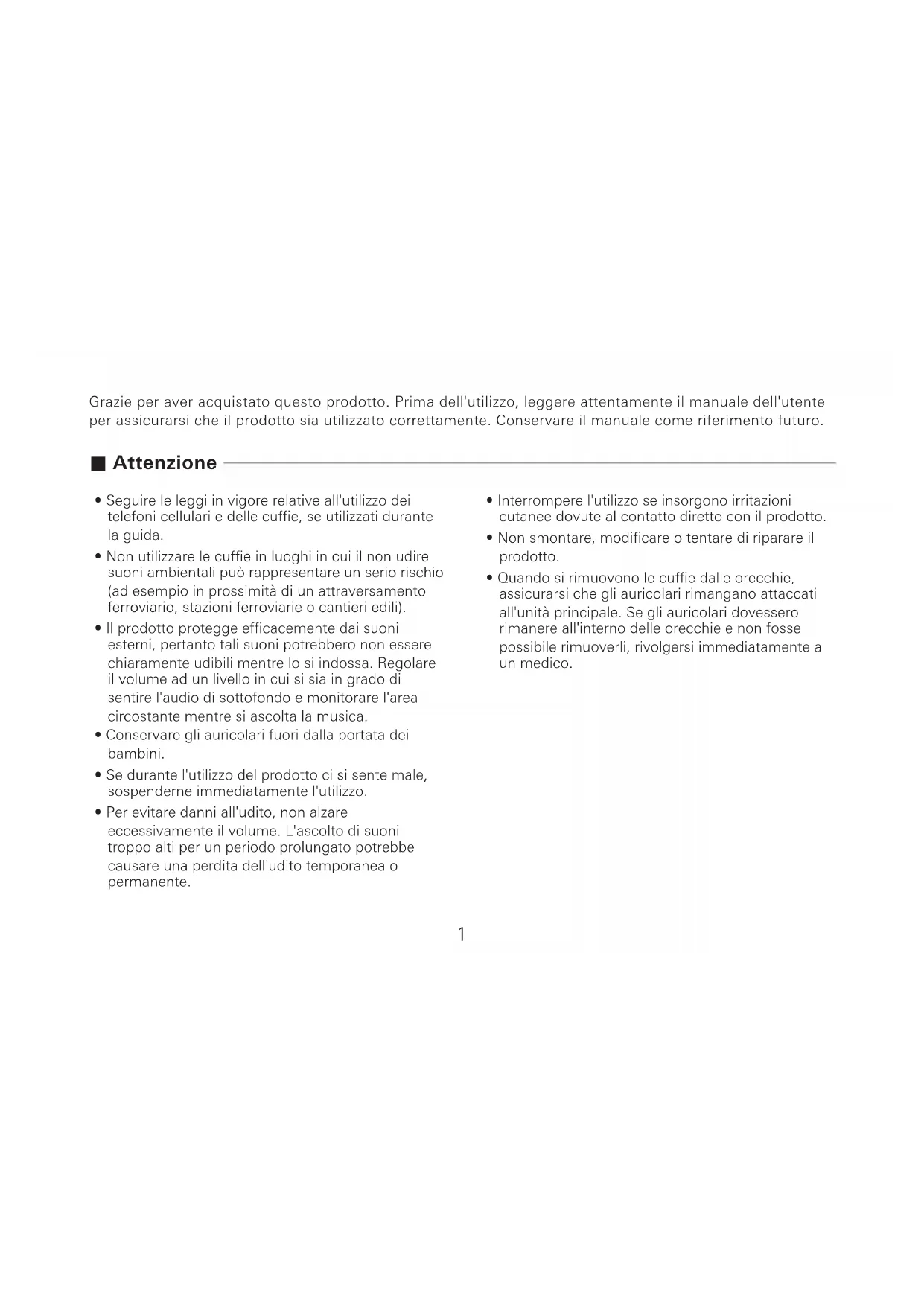 - Il prodotto protegge efficacemente dai suoni esterni, pertanto tali suoni potrebbero non essere chiaramente udibili mentre lo si indossa. Regolare il volume ad un livello in cui si sia in grado di sentire l'audio di sottofondo e monitorare l'area circostante mentre si ascolta la musica.
