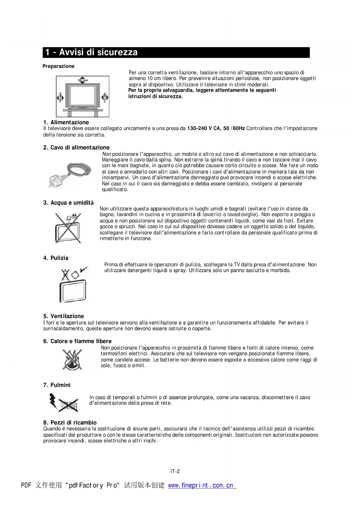 PDF 文件使用 "pdfFactory Pro" 试用版本创建 ÿ www.fineprint.com.cnIT-2 1 – Avvisi di sicurezza Preparazione Per una corretta ventilazione, lasciare intorno all’apparecchio uno spazio di almeno 10 cm libero. Per prevenire situazioni pericolose, non posizionare oggetti sopra al dispositivo. Utilizzare il televisore in climi moderati. Per la propria salvaguardia, leggere attentamente le seguenti istruzioni di sicurezza.