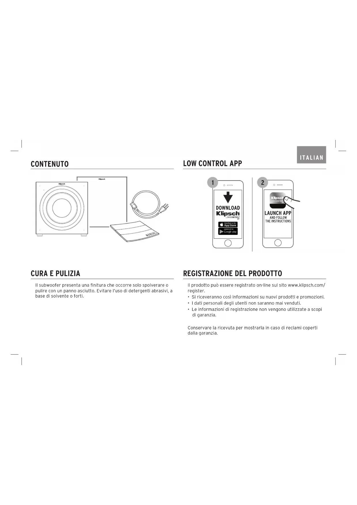 Il prodotto può essere registrato on-line sul sito www.klipsch.com/register.• Si riceveranno così informazioni su nuovi prodotti e promozioni.• I dati personali degli utenti non saranno mai venduti.• Le informazioni di registrazione non vengono utilizzate a scopi di garanzia. Conservare la ricevuta per mostrarla in caso di reclami coperti dalla garanzia.