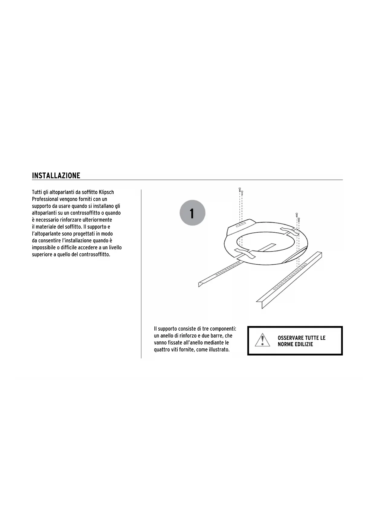 NORME EDILIZIE Tutti gli altoparlanti da soffitto Klipsch Professional vengono forniti con un supporto da usare quando si installano gli altoparlanti su un controsoffitto o quando è necessario rinforzare ulteriormente il materiale del soffitto. Il supporto e l’altoparlante sono progettati in modo da consentire l’installazione quando è impossibile o difficile accedere a un livello superiore a quello del controsoffitto. Il supporto consiste di tre componenti: un anello di rinforzo e due barre, che vanno fissate all’anello mediante le quattro viti fornite, come illustrato.2 3 INSTALLAZIONE