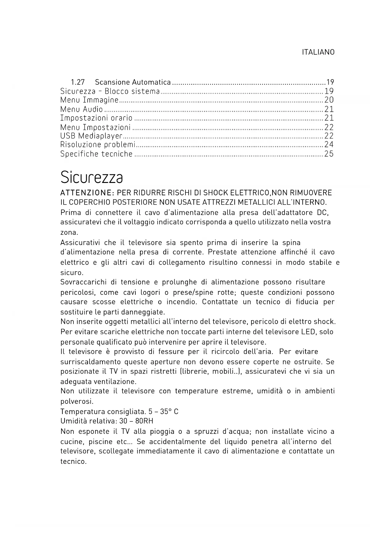 - ! Specifiche tecniche ! Sicurezza ATTENZIONE: PER RIDURRE RISCHI DI SHOCK ELETTRICO,NON RIMUOVERE IL COPERCHIO POSTERIORE NON USATE ATTREZZI METALLICI ALL’INTERNO. Prima di connettere il cavo d’alimentazione alla presa dell’adattatore DC, assicuratevi che il voltaggio indicato corrisponda a quello utilizzato nella vostra zona. Assicurativi che il televisore sia spento prima di inserire la spina d’alimentazione nella presa di corrente. Prestate attenzione affinché il cavo elettrico e gli altri cavi di collegamento risultino connessi in modo stabile e sicuro. Sovraccarichi di tensione e prolunghe di alimentazione possono risultare pericolosi, come cavi logori o prese/spine rotte; queste condizioni possono causare scosse elettriche o incendio. Contattate un tecnico di fiducia per sostituire le parti danneggiate. Non inserite oggetti metallici all’interno del televisore, pericolo di elettro shock. Per evitare scariche elettriche non toccate parti interne del televisore LED, solo personale qualificato può intervenire per aprire il televisore. Il televisore è provvisto di fessure per il ricircolo dell’aria. Per evitare surriscaldamento queste aperture non devono essere coperte ne ostruite. Se posizionate il TV in spazi ristretti (librerie, mobili ), assicuratevi che vi sia un adeguata ventilazione. Non utilizzate il televisore con temperature estreme, umidità o in ambienti polverosi. Temperatura consigliata. 5 – 35° C Umidità relativa: 30 – 80RH Non esponete il TV alla pioggia o a spruzzi d’acqua; non installate vicino a cucine, piscine etc… Se accidentalmente del liquido penetra all’interno del televisore, scollegate immediatamente il cavo di alimentazione e contattate un tecnico.4 Potete pulire lo schermo LED/LCD se necessario con un panno morbido leggermente umido, ricordatevi di scollegare il televisore prima di pulirlo. Non usate solventi come benzene per pulire il televisore, danneggereste la superficie dello schermo. Posizionate il televisore su di una superficie solida e maneggiatelo con attenzione. lo schermo è formato da un vetro sottile e protetto da una lamina di plastica, liquidi abrasivi o strisciate rovinano in modo permanente il pannello LED/LCD. Non pulite lo schermo con sostanze quali: acetone, alcol etilico, toluene, acido etilico, metilico o cloridrico; queste sostanze rovinano il pannello LED/LCD. Posizionate il televisore in modo che sia facilitato l’accesso alla presa di corrente. Non ponete fonti di calore o fiamma come ad esempio candele, sopra il televisore. Nessun oggetto contenente liquidi come vasi o bottiglie, deve essere posizionato sopra o nelle vicinanze del TV. Il simbolo del bidoncino sbarrato indica che è vietato disperdere questo prodotto nell’ ambiente o gettarlo nei comuni rifiuti urbani misti. Chi non rispetta tale regola è sanzionabile secondo legislazione vigente. Un corretto smaltimento dell’apparecchio consente di evitare potenziali danni all’ambiente e alla salute umana, nonché di facilitare il riciclaggio dei componenti e dei materiali contenuti in esso, con un conseguente risparmio di energia e risorse. Il produttore istituisce un sistema di recupero dei Rifiuti da Apparecchiature Elettriche ed Elettroniche (RAEE) del prodotto oggetto di raccolta separata e sistemi di trattamento, avvalendosi di impianti conformi alle disposizioni vigenti in materia. Portare il prodotto non più utilizzabile (ed eventuali suoi accessori, ivi comprese le batterie) presso un centro di raccolta autorizzato a gestire rifiuti di apparecchiature elettriche ed elettroniche. In alternativa, è possibile riconsegnare al rivenditore l’apparecchiatura usata o a fine vita, all’atto dell’acquisto di una nuova di tipo equivalente oppure a titolo gratuito in caso di apparecchi ad uso domestico di dimensioni esterne inferiori a 25 cm.ITALIANO Descrizione TV p. 25