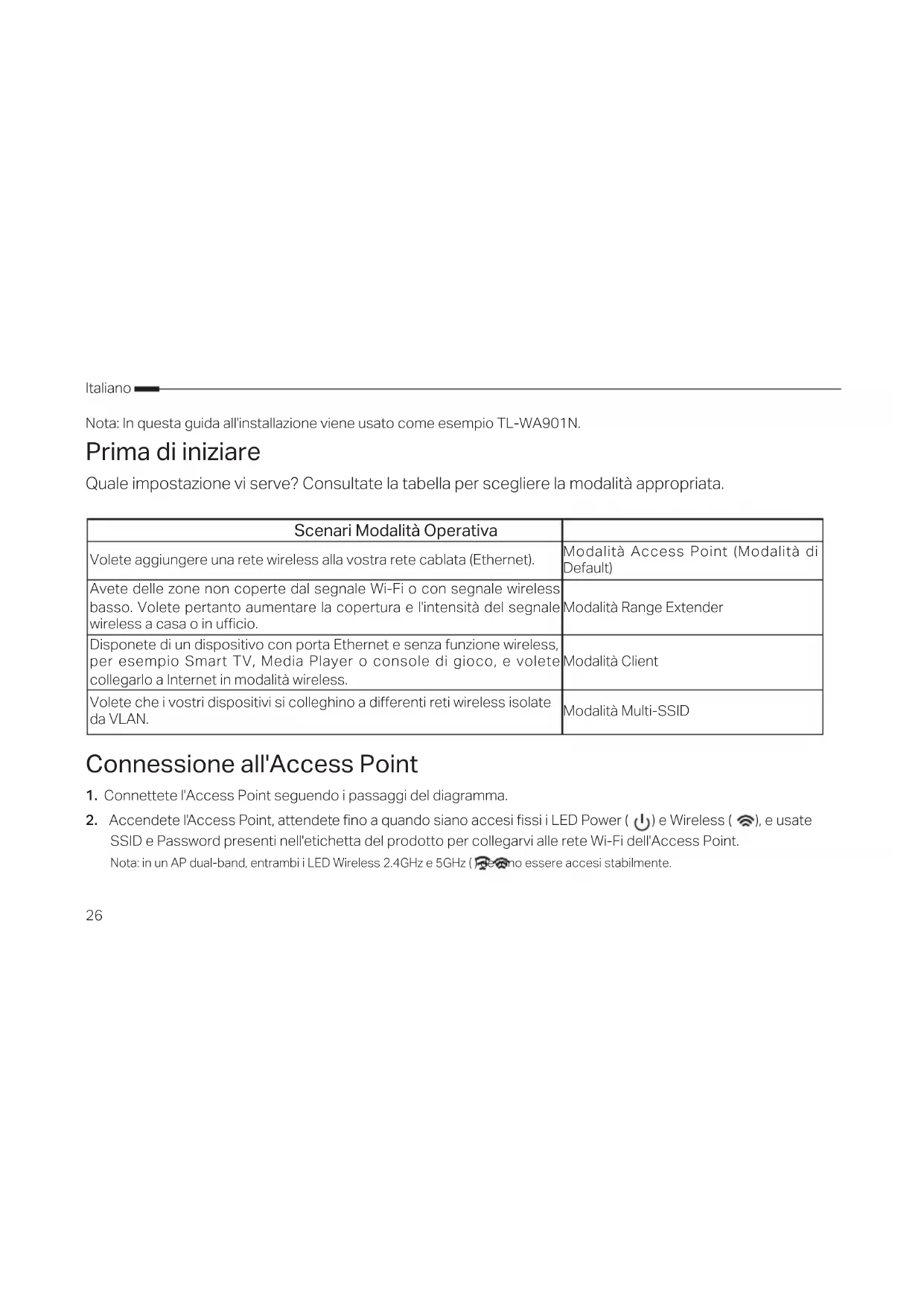 - Déplacer le point d'accès à un autre endroit, à l'écart des appareils Bluetooth et de tout autre appareil électroménager tel que les téléphones sans l, les fours à micro ondes, les baby phones etc. an de minimiser l'inuence des interférences.26 Italiano Nota: In questa guida all'installazione viene usato come esempio TL-WA901N. Prima di iniziare Quale impostazione vi serve? Consultate la tabella per scegliere la modalità appropriata. Scenari Modalità Operativa Volete aggiungere una rete wireless alla vostra rete cablata (Ethernet). Modalità Access Point (Modalità di Default) Avete delle zone non coperte dal segnale Wi-Fi o con segnale wireless basso. Volete pertanto aumentare la copertura e l'intensità del segnale wireless a casa o in ucio. Modalità Range Extender Disponete di un dispositivo con porta Ethernet e senza funzione wireless, per esempio Smart TV, Media Player o console di gioco, e volete collegarlo a Internet in modalità wireless. Modalità Client Volete che i vostri dispositivi si colleghino a dierenti reti wireless isolate da VLAN. Modalità Multi-SSID Connessione all'Access Point