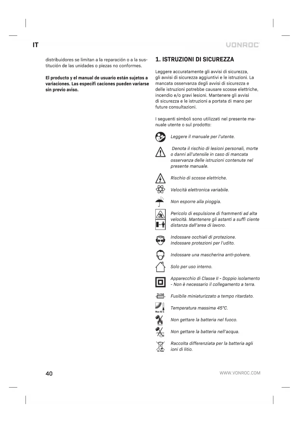 - Sono state utilizzate parti di ricambio non origi- nali. Ciò costituisce l’unica garanzia espressa o implicita fornita dall’azienda. Non esistono altre garanzie espresse o implicite che si estendono oltre il presente documento, ivi comprese le garanzie im plicite di commerciabilità e idoneità per uno scopo particolare. In nessun caso VONROC sarà responsa- bile di eventuali danni incidentali o consequenziali. I rimedi dei rivenditori saranno limitati alla ripara- zione o sostituzione di unità o parti non conformi. Il prodotto e il manuale per l’utente sono soggetti a modifi che. I dati tecnici possono essere modifi cati senza ulteriore notifi ca.48