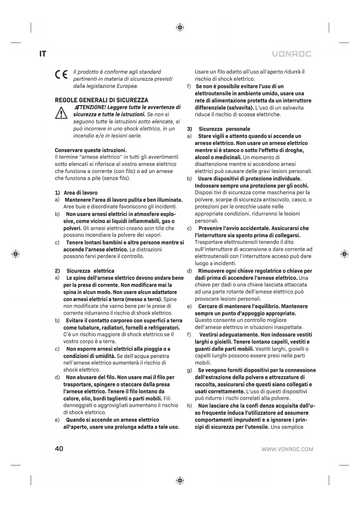 I prodotti VONROC sono sviluppati secondo i più elevati standard di qualità e viene garantita l’assen- za di difetti nei materiali e nella manodopera per il periodo contrattuale a partire dalla data di acquisto originale. Qualora il prodotto dovesse subire un guasto qualsiasi durante questo periodo a causa di difetti nei materiali e/o nella manodopera, si prega di contattare direttamente il VONROC.46