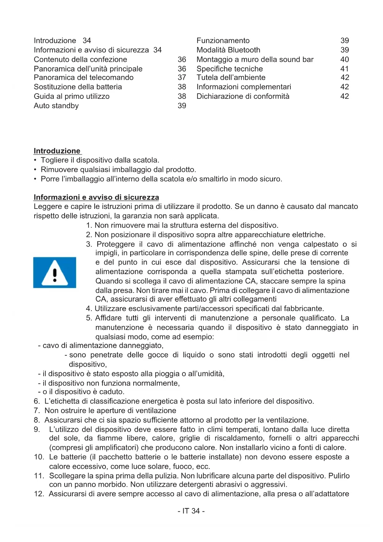 Introduzione 34 Informazioni e avviso di sicurezza 34 Contenuto della confezione 36 Panoramica dell’unità principale 36 Panoramica del telecomando 37 Sostituzione della batteria 38 Guida al primo utilizzo 38 Auto standby 39 Funzionamento 39 Modalità Bluetooth 39 Montaggio a muro della sound bar 40 Speciche tecniche 41 Tutela dell’ambiente 42 Informazioni complementari 42 Dichiarazione di conformità 42- IT 35 - per disconnettere il dispositivo dalla corrente se necessario.