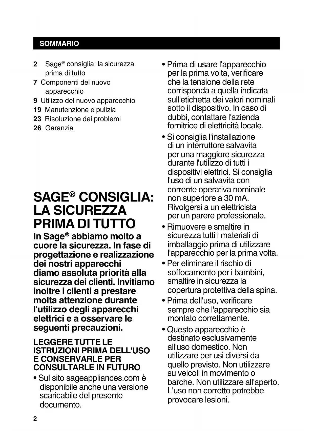 In Sage® abbiamo molto a cuore la sicurezza. In fase di progettazione e realizzazione dei nostri appearecchi diamo assoluta priorità alla sicurezza dei clienti. Invitiamo inoltre i clienti a prestare molta attenzione durante l'utilizzo degli appearecchi elettrici e a osservare le seguenti precauzioni.