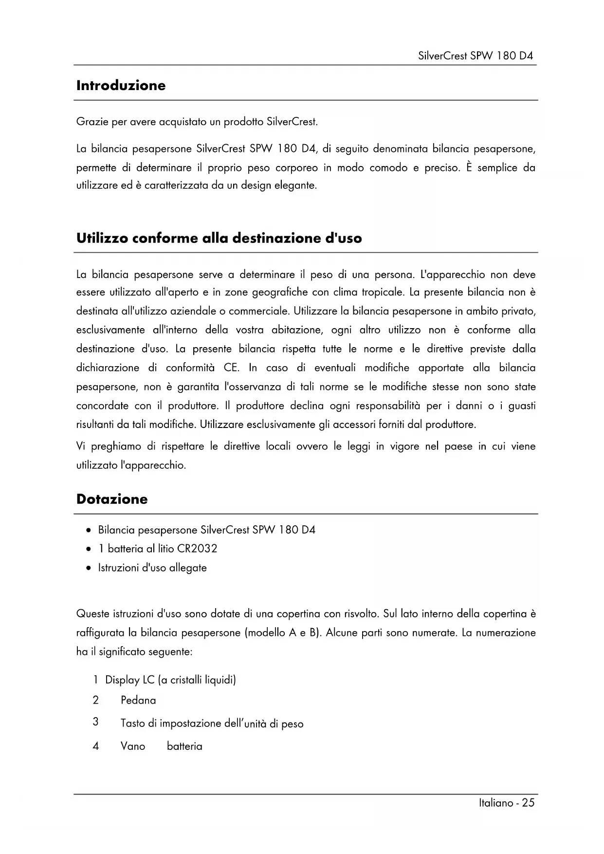 - Informazioni sulla garanzia e sull'assistenza SilverCrest SPW 180 D4 Italiano - 25 Introduzione Grazie per avere acquistato un prodotto SilverCrest. La bilancia pesapersone SilverCrest SPW 180 D4, di seguito denominata bilancia pesapersone, permette di determinare il proprio peso corporeo in modo comodo e preciso. È semplice da utilizzare ed è caratterizzata da un design elegante. Utilizzo conforme alla destinazione d'uso La bilancia pesapersone serve a determinare il peso di una persona. L'apparecchio non deve essere utilizzato all'aperto e in zone geografiche con clima tropicale. La presente bilancia non è destinata all'utilizzo aziendale o commerciale. Utilizzare la bilancia pesapersone in ambito privato, esclusivamente all'interno della vostra abitazione, ogni altro utilizzo non è conforme alla destinazione d'uso. La presente bilancia rispetta tutte le norme e le direttive previste dalla dichiarazione di conformità CE. In caso di eventuali modifiche apportate alla bilancia pesapersone, non è garantita l'osservanza di tali norme se le modifiche stesse non sono state concordate con il produttore. Il produttore declina ogni responsabilità per i danni o i guasti risultanti da tali modifiche. Utilizzare esclusivamente gli accessori forniti dal produttore. Vi preghiamo di rispettare le direttive locali ovvero le leggi in vigore nel paese in cui viene utilizzato l'apparecchio. Dotazione Bilancia pesapersone SilverCrest SPW 180 D4 1 batteria al litio CR2032 Istruzioni d'uso allegate Queste istruzioni d'uso sono dotate di una copertina con risvolto. Sul lato interno della copertina è raffigurata la bilancia pesapersone (modello A e B). Alcune parti sono numerate. La numerazione ha il significato seguente: 1 Display LC (a cristalli liquidi) 2 Pedana p. 33