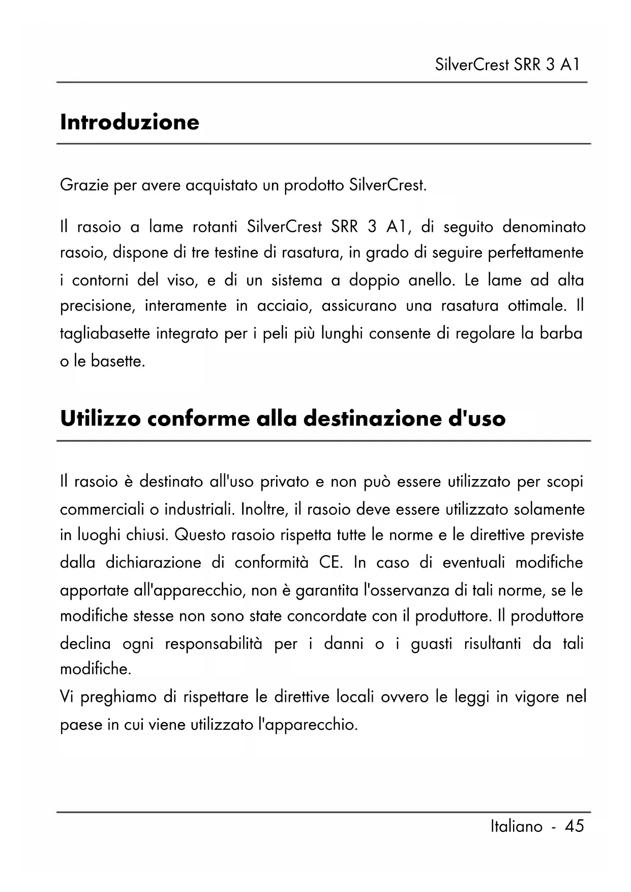 - Informazioni sulla garanzia e sull'assistenza SilverCrest SRR 3 A1 Italiano - 45 Introduzione Grazie per avere acquistato un prodotto SilverCrest. Il rasoio a lame rotanti SilverCrest SRR 3 A1, di seguito denominato rasoio, dispone di tre testine di rasatura, in grado di seguire perfettamente i contorni del viso, e di un sistema a doppio anello. Le lame ad alta precisione, interamente in acciaio, assicurano una rasatura ottimale. Il tagliabasette integrato per i peli più lunghi consente di regolare la barba o le basette. Utilizzo conforme alla destinazione d'uso Il rasoio è destinato all'uso privato e non può essere utilizzato per scopi commerciali o industriali. Inoltre, il rasoio deve essere utilizzato solamente in luoghi chiusi. Questo rasoio rispetta tutte le norme e le direttive previste dalla dichiarazione di conformità CE. In caso di eventuali modifiche apportate all'apparecchio, non è garantita l'osservanza di tali norme, se le modifiche stesse non sono state concordate con il produttore. Il produttore declina ogni responsabilità per i danni o i guasti risultanti da tali modifiche. Vi preghiamo di rispettare le direttive locali ovvero le leggi in vigore nel paese in cui viene utilizzato l'apparecchio.SilverCrest SRR 3 A1 p. 63