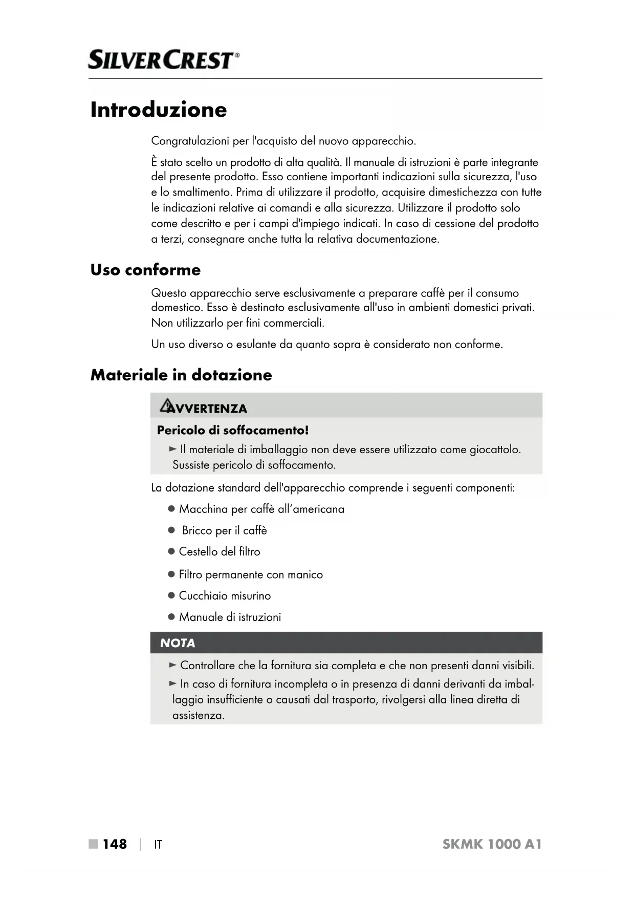 IT SKMK 1000 A1 Introduzione Congratulazioni per l'acquisto del nuovo apparecchio. È stato scelto un prodotto di alta qualità. Il manuale di istruzioni è parte integrante del presente prodotto. Esso contiene importanti indicazioni sulla sicurezza, l'uso e lo smaltimento. Prima di utilizzare il prodotto, acquisire dimestichezza con tutte le indicazioni relative ai comandi e alla sicurezza. Utilizzare il prodotto solo come descritto e per i campi d'impiego indicati. In caso di cessione del prodotto a terzi, consegnare anche tutta la relativa documentazione. Uso conforme Questo apparecchio serve esclusivamente a preparare caffè per il consumo domestico. Esso è destinato esclusivamente all'uso in ambienti domestici privati. Non utilizzarlo per fini commerciali. Un uso diverso o esulante da quanto sopra è considerato non conforme. Materiale in dotazione AVVERTENZA Pericolo di soffocamento! ► Il materiale di imballaggio non deve essere utilizzato come giocattolo. Sussiste pericolo di soffocamento. La dotazione standard dell'apparecchio comprende i seguenti componenti: ▯ Macchina per caffè all‘americana ▯ Bricco per il caffè ▯ Cestello del filtro ▯ Filtro permanente con manico ▯ Cucchiaio misurino ▯ Manuale di istruzioni NOTA ► Controllare che la fornitura sia completa e che non presenti danni visibili. ► In caso di fornitura incompleta o in presenza di danni derivanti da imbal- laggio insufficiente o causati dal trasporto, rivolgersi alla linea diretta di assistenza.IT