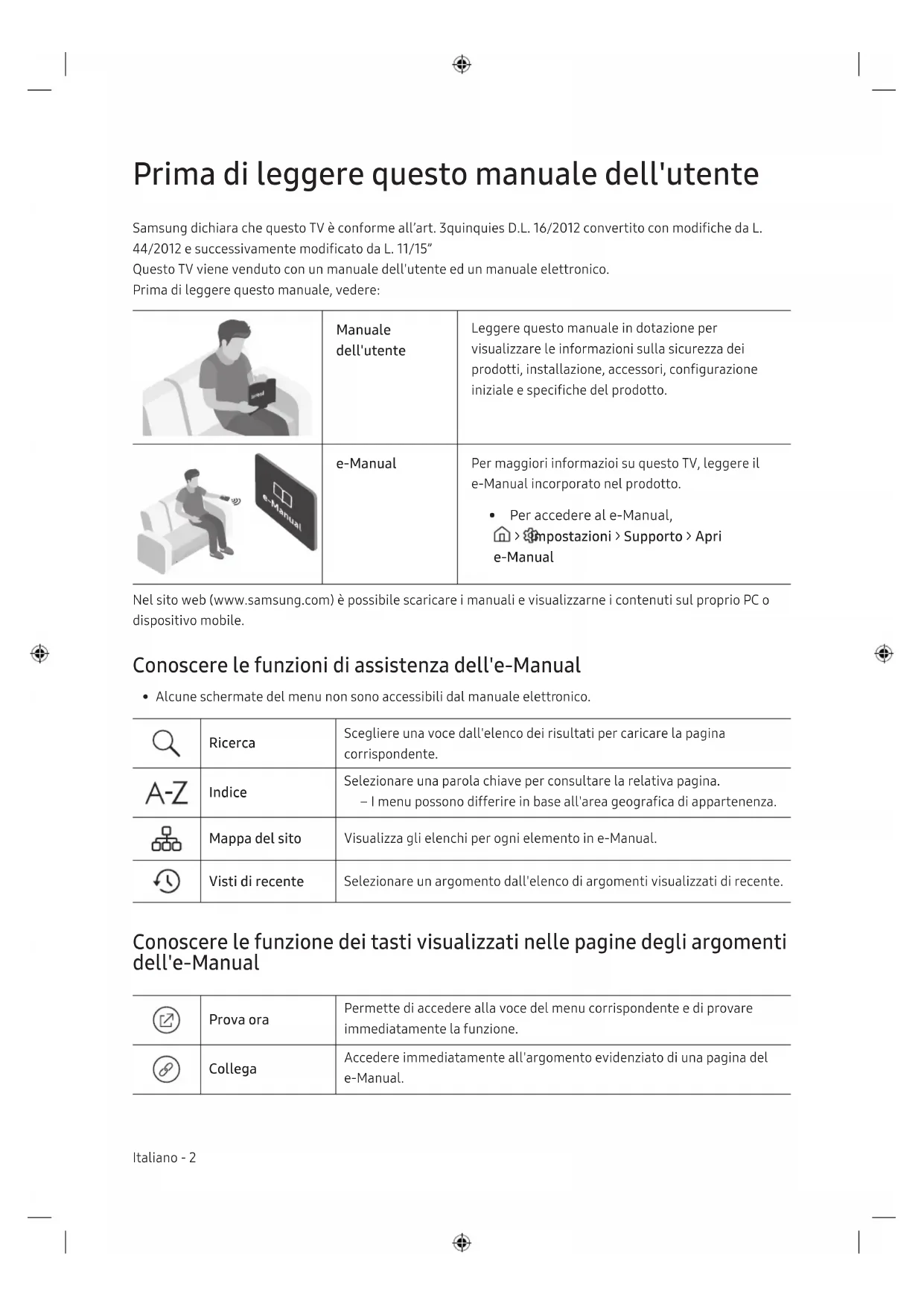 - Per accedere al e-Manual, > Impostazioni > Supporto > Apri e-Manual Nel sito web (www.samsung.com) è possibile scaricare i manuali e visualizzarne i contenuti sul proprio PC o dispositivo mobile. Conoscere le funzioni di assistenza dell'e-Manual
