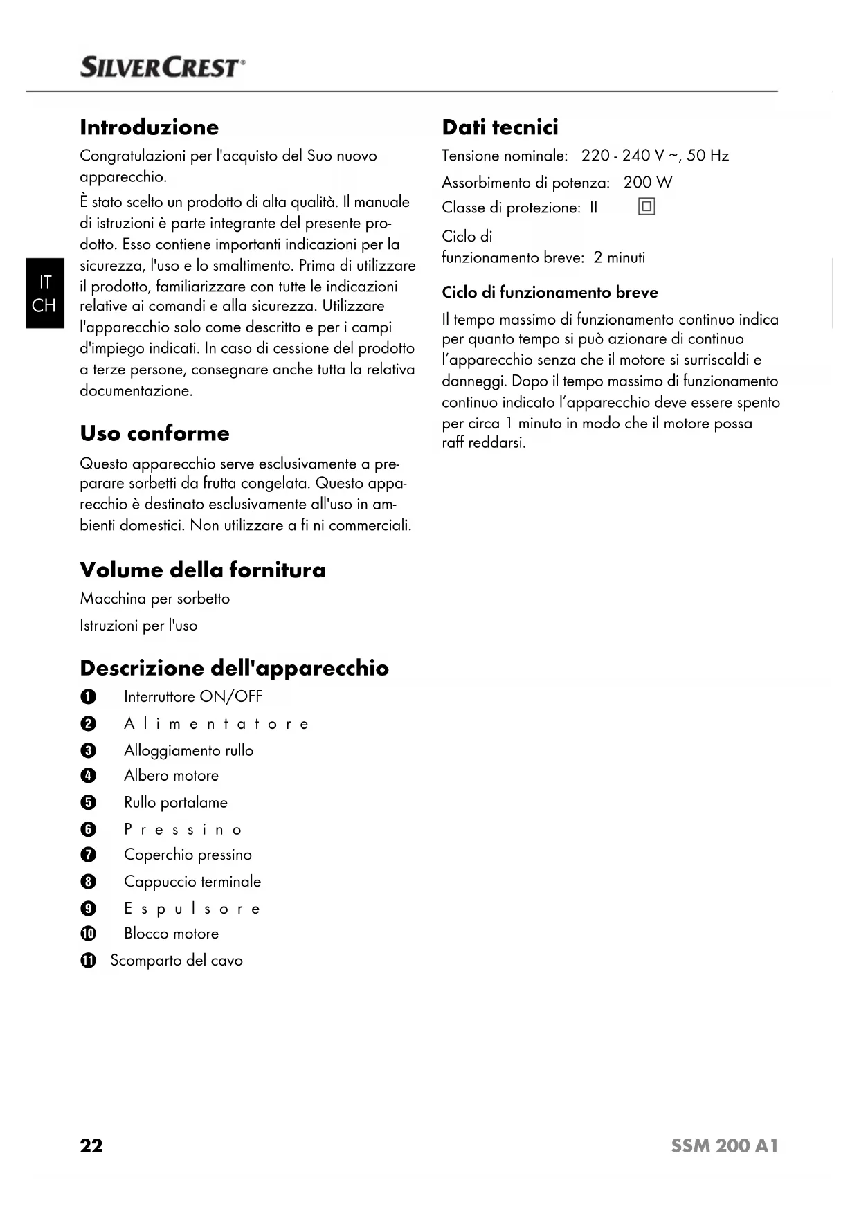 Introduzione Congratulazioni per l'acquisto del Suo nuovo apparecchio. È stato scelto un prodotto di alta qualità. Il manuale di istruzioni è parte integrante del presente pro- dotto. Esso contiene importanti indicazioni per la sicurezza, l'uso e lo smaltimento. Prima di utilizzare il prodotto, familiarizzare con tutte le indicazioni relative ai comandi e alla sicurezza. Utilizzare l'apparecchio solo come descritto e per i campi d'impiego indicati. In caso di cessione del prodotto a terze persone, consegnare anche tutta la relativa documentazione. Uso conforme Questo apparecchio serve esclusivamente a pre- parare sorbetti da frutta congelata. Questo appa- recchio è destinato esclusivamente all'uso in am- bienti domestici. Non utilizzare a fi ni commerciali. Volume della fornitura Macchina per sorbetto Istruzioni per l'uso Descrizione dell'apparecchio 1 Interruttore ON/OFF 2 Alimentatore 3 Alloggiamento rullo 4 Albero motore 5 Rullo portalame 6 Pressino 7 Coperchio pressino 8 Cappuccio terminale 9 Espulsore 0 Blocco motore q Scomparto del cavo Dati tecnici Tensione nominale: 220 - 240 V ∼, 50 Hz Assorbimento di potenza: 200 W Classe di protezione: II Ciclo di funzionamento breve: 2 minuti Ciclo di funzionamento breve Il tempo massimo di funzionamento continuo indica per quanto tempo si può azionare di continuo l’apparecchio senza che il motore si surriscaldi e danneggi. Dopo il tempo massimo di funzionamento continuo indicato l’apparecchio deve essere spento per circa 1 minuto in modo che il motore possa raff reddarsi.23 SSM 200 A1