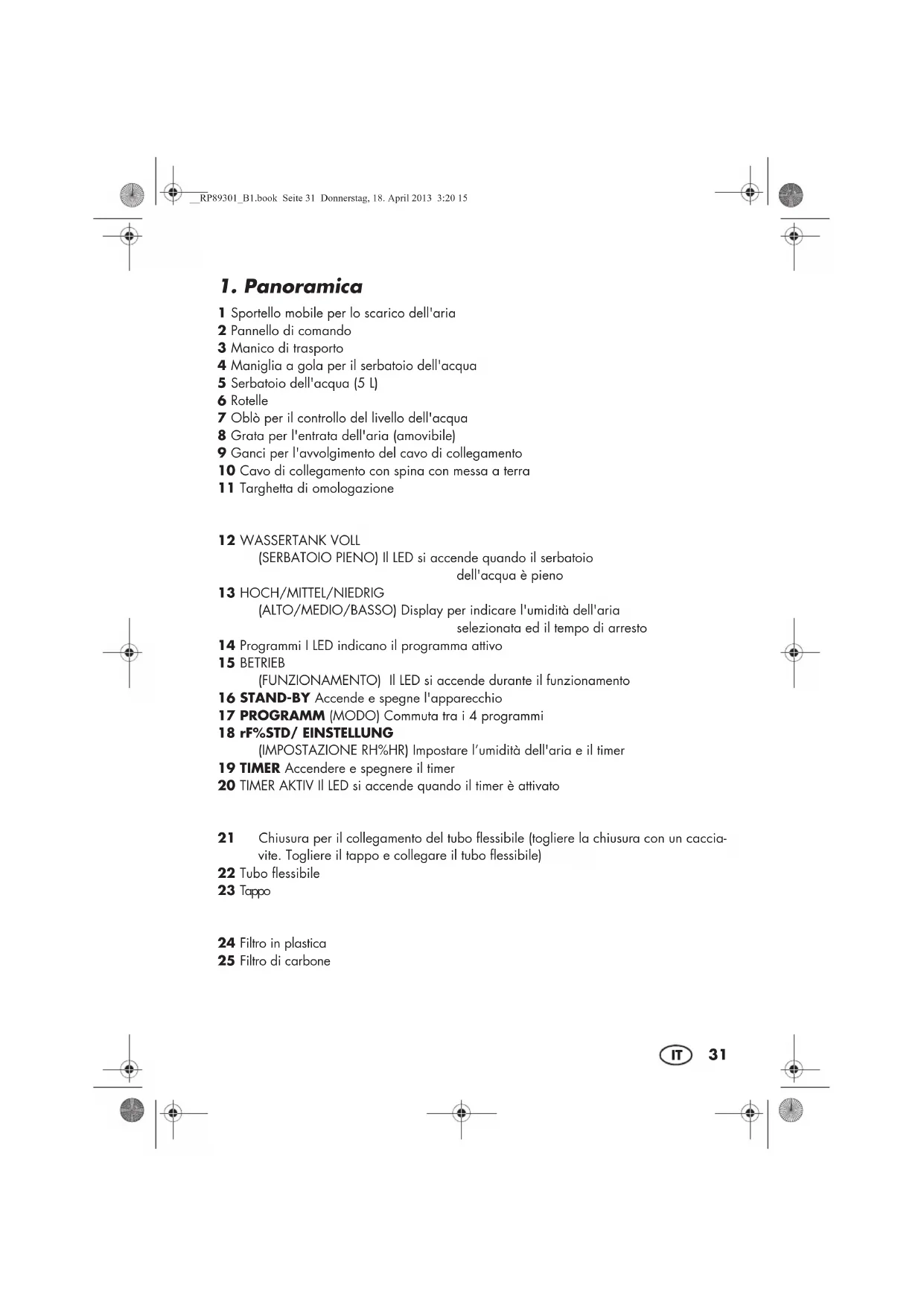 (ALTO/MEDIO/BASSO) Display per indicare l'umidità dell'aria selezionata ed il tempo di arresto 14 Programmi I LED indicano il programma attivo 15 BETRIEB (FUNZIONAMENTO) Il LED si accende durante il funzionamento 16 STAND-BY Accende e spegne l'apparecchio 17 PROGRAMM (MODO) Commuta tra i 4 programmi 18 rF%STD/ EINSTELLUNG (IMPOSTAZIONE RH%HR) Impostare l’umidità dell'aria e il timer 19 TIMER Accendere e spegnere il timer 20 TIMER AKTIV Il LED si accende quando il timer è attivato 21 Chiusura per il collegamento del tubo flessibile (togliere la chiusura con un caccia- vite. Togliere il tappo e collegare il tubo flessibile) 22 Tubo flessibile 23 Tappo 24 Filtro in plastica 25 Filtro di carbone __RP89301_B1.book Seite 31 Donnerstag, 18. April 2013 3:20 1532