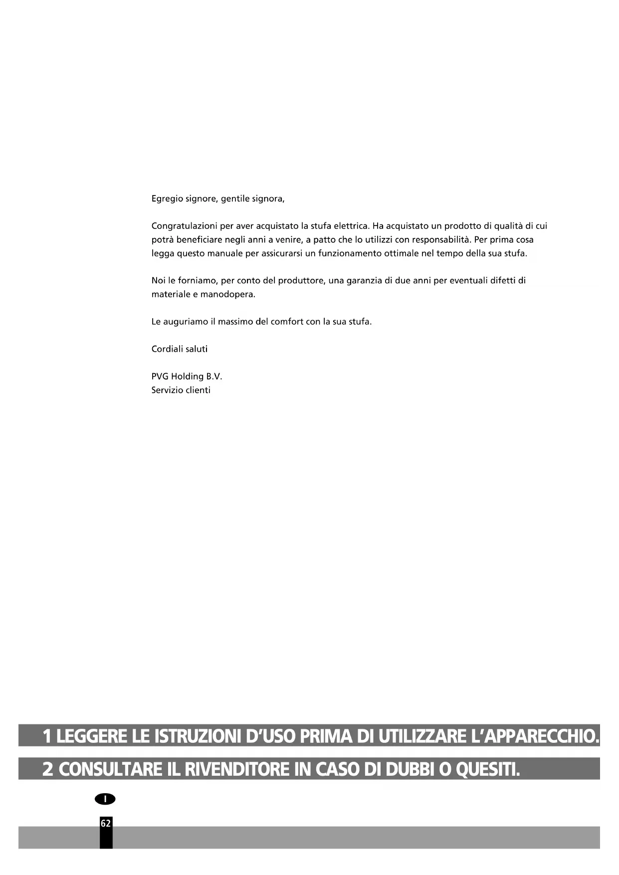 Egregio signore, gentile signora, Congratulazioni per aver acquistato la stufa elettrica. Ha acquistato un prodotto di qualità di cui potrà beneficiare negli anni a venire, a patto che lo utilizzi con responsabilità. Per prima cosa legga questo manuale per assicurarsi un funzionamento ottimale nel tempo della sua stufa. Noi le forniamo, per conto del produttore, una garanzia di due anni per eventuali difetti di materiale e manodopera. Le auguriamo il massimo del comfort con la sua stufa. Cordiali saluti PVG Holding B.V. Servizio clientiWICHTIGE BAUTEILE BedienfeldTrockenluftauslassAbnehmbarer WassertankFeuchtlufteinlassLuftfilterAbflussrohr (ø 13mm) mit Kappe LenkrolleNetzstecker und NetzkabelGriffABC4EFGHI 631 BITTE LESEN SIE ZUERST DIE GEBRAUCHSANLEITUNG.2 BEI FRAGEN, WENDEN SIE SICH AN IHREN HÄNDLER. COMPONENTI PRINCIPALI Piastra anteriore Presa dell’aria fredda Pannello di controllo Uscita dell’aria calda Telecomando