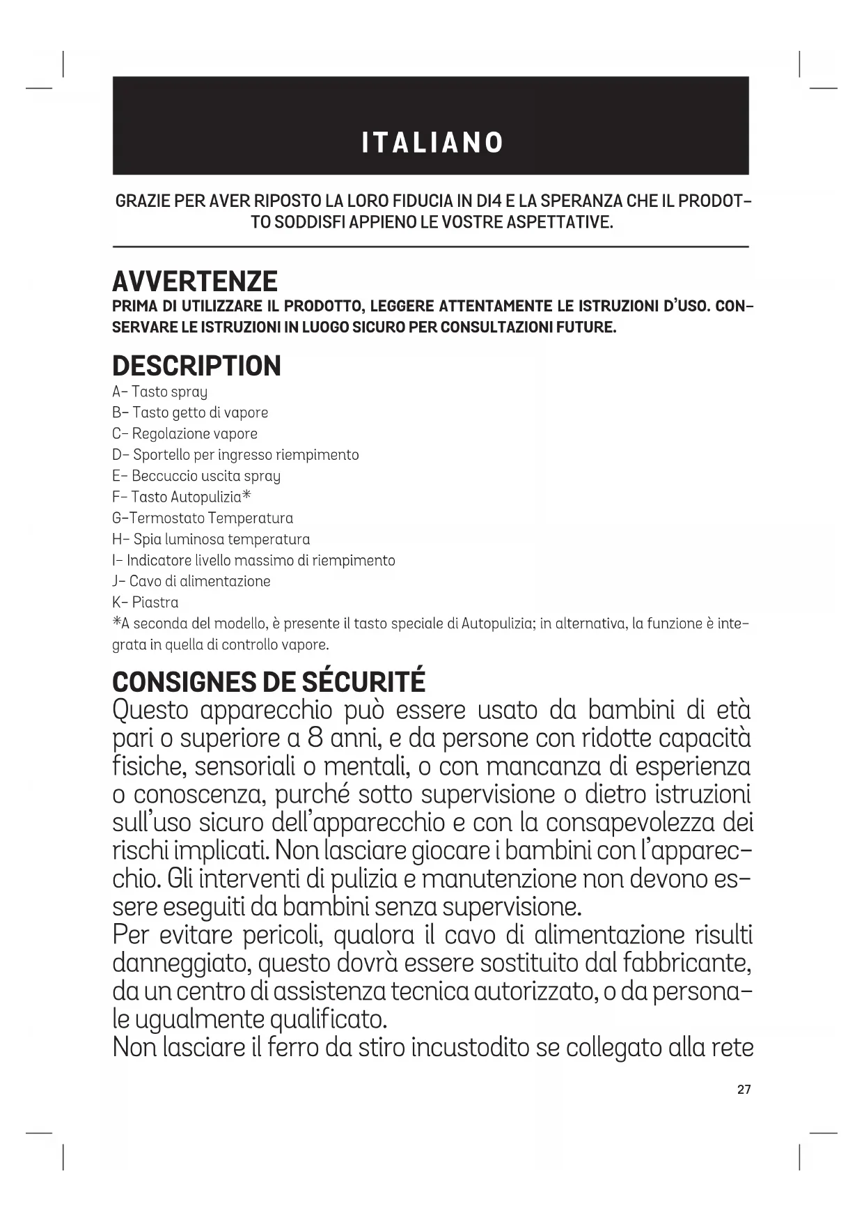 Con acqua dura o semi-dura, o se il ferro viene utilizzato di frequente, si consiglia di effettuare l’au- topulizia ogni due settimane Prima di pulire il verro da stiro a vapore, assicurarsi che questo sia scollegato dalla rete elettrica e completamente freddo. Non usare detergenti abrasivi. Per pulire le superfici esterne, usare un panno morbido inumidito e asciugare. Per non danneggiare le superfici, non usare solventi chimici. Pulizia della piastra: per non danneggiare la superficie della piastra, non utilizzare spugne abrasive. Per eliminare residui bruciati, far scorrere la piastra ancora calda su un panno umido. Per pulire la piastra, usare solo un panno morbido inumidito e asciugare.31 AUTOPULIZIA Riempire il serbatoio fino a metà della sua capienza. Impostare la manopola della temperatura al massimo. Inserire la spina alla presa di corrente. Lasciare riscaldare il ferro da stiro fino allo spegnimento della spia luminosa. Scollegare il ferro a vapore dalla rete elettrica. Tenere il ferro da stiro in posizione orizzontale sulla vasca dell’acquaio e premere il tasto di Autopuli- zia; in caso quest’ultimo non sia presente, impostare il controllo vapore sul valore massimo. L’acqua bollente e il vapore verranno espulsi dai fori della piastra, lavando via le impurità. Far scorrere quindi il ferro da stiro su un panno (preferibilmente) vecchio. In questo modo, la piastra rimarrà as- ciutta tra una stiratura e l’altra. SISTEMA ANTI-CALC Uno speciale filtro in resina all’interno del serbatoio ammorbidisce l’acqua, impedendo ai residui di accumularsi sulla piastra. Il filtro in resina è permanente e non richiede sostituzione. Nota: Usare solo acqua di rubinetto. L’acqua distillata o demineralizzata annulla l’azione del sistema anticalcare “Zero-Calc” alterandone le caratteristiche fisico-chimiche. Non usare additivi chimici, sostanze profumate o decalcificanti. Il mancato rispetto delle norme so- praelencate provoca l’annullamento della garanzia. SISTEMA ANTI-GOCCIA Grazie al sistema anti-goccia, è possibile stirare perfettamente anche i capi più delicati. Stirare questi indumenti sempre a basse temperature. In questi casi, la piastra si raffredda e, invece dell’emissione di vapore, si ha lo sgocciolamento di acqua bollente che può lasciare segni o macchie sull’indumento. Ecco quindi che il sistema Anti-goccia entra automaticamente in azione, impedendo la vaporizzazione e permettendo di stirare i capi più delicati senza correre il rischio di rovinarli o macchiarli. AUTO SPEGNIMENTO Un dispositivo elettronico di sicurezza spegne automaticamente l’elemento riscaldante quando il ferro rimane per più di 30 secondi nella stessa posizione orizzontale. In caso di posizione verticale, l’elemento si spegne dopo 8 minuti. Per indicare lo spegnimento dell’elemento riscaldante, la spia luminosa di auto spegnimento comincerà a lampeggiare. La stessa si spegnerà non appena riprende l’utilizzo del ferro da stiro. Si accenderà la spia luminosa dell’alimentazione. Ciò indica che il riscaldamento del ferro da stiro è di nuovo attivo. Aspettare fino allo spegnimento della spia luminosa. Il ferro sarà quindi pronto per stirare.32