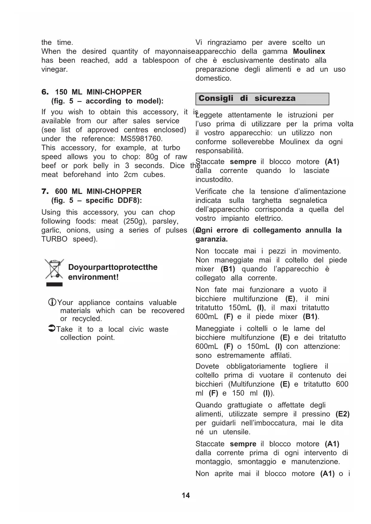 (fig. 5 – specific DDF8): Using this accessory, you can chop following foods: meat (250g), parsley, garlic, onions, using a series of pulses (at TURBO speed). Do your part to protect the environment! Your appliance contains valuable materials which can be recovered or recycled. Take it to a local civic waste collection point. Vi ringraziamo per avere scelto un apparecchio della gamma Moulinex che è esclusivamente destinato alla preparazione degli alimenti e ad un uso domestico. Leggete attentamente le istruzioni per l’uso prima di utilizzare per la prima volta il vostro apparecchio: un utilizzo non conforme solleverebbe Moulinex da ogni responsabilità. Staccate sempre il blocco motore (A1) dalla corrente quando lo lasciate incustodito. Verificate che la tensione d’alimentazione indicata sulla targhetta segnaletica dell’apparecchio corrisponda a quella del vostro impianto elettrico. Ogni errore di collegamento annulla la garanzia. Non toccate mai i pezzi in movimento. Non maneggiate mai il coltello del piede mixer (B1) quando l’apparecchio è collegato alla corrente. Non fate mai funzionare a vuoto il bicchiere multifunzione (E), il mini tritatutto 150mL (I), il maxi tritatutto 600mL (F) e il piede mixer (B1). Maneggiate i coltelli o le lame del bicchiere multifunzione (E) e dei tritatutto 600mL (F) o 150mL (I) con attenzione: sono estremamente affilati. Dovete obbligatoriamente togliere il coltello prima di vuotare il contenuto dei bicchieri (Multifunzione (E) e tritatutto 600 ml (F) e 150 ml (I)). Quando grattugiate o affettate degli alimenti, utilizzate sempre il pressino (E2) per guidarli nell’imboccatura, mai le dita né un utensile. Staccate sempre il blocco motore (A1) dalla corrente prima di ogni intervento di montaggio, smontaggio e manutenzione. Non aprite mai il blocco motore (A1) o i Consigli di sicurezza15 riduttori (C1, E6 e F3). Non dovete effettuare nessun altro intervento se non la pulizia e la manutenzione ordinaria. Se il cavo d’alimentazione o la spina sono danneggiati, non utilizzate l’apparecchio. Per evitare qualsiasi pericolo, fateli obbligatoriamente sostituire da un centro assistenza autorizzato Moulinex (vedere elenco nel libretto «Moulinex service»). Per la vostra sicurezza, utilizzate solo accessori e pezzi di ricambio Moulinex adatti al vostro apparecchio. Non utilizzare il bicchiere multifunzione (E) e i tritatutto (I e F) come recipienti per altri usi (congelamento, cottura, sterilizzazione). Non versate mai liquidi bollenti nel bicchiere multifunzione e nei tritatutto (I) e (F). Legate i capelli lunghi, e non fate pendere sciarpe, cravatte, ecc. … al disopra degli accessori in funzione. Non staccate mai il blocco motore (A1) dalla corrente tirando il cavo di alimentazione. Il vostro apparecchio è destinato soltanto a un uso domestico. Qualsiasi utilizzo professionale, o non conforme alle istruzioni annulla la garanzia e deresponsabilizza il fornitore. L’apparecchio non deve essere utilizzato vicino a un forno a microonde o a un telefono cellulare. Questo apparecchio non deve essere utilizzato da persone (compresi i bambini) con ridotte capacità fisiche, sensoriali o mentali, o da persone prive di esperienza o di conoscenza, tranne se hanno potuto beneficiare, tramite una persona responsabile della loro sicurezza, di una sorveglianza o di istruzioni preliminari relative all’utilizzo dell’apparecchio. È opportuno sorvegliare i bambini per assicurarsi che non giochino con l’apparecchio. Non lasciate che i bambini utilizzino l’apparecchio senza sorveglianza. Prima del primo utilizzo, pulite tutti gli accessori con acqua e sapone. Risciacquate e asciugateli accuratamente. Collegate l’apparecchio alla corrente. L’avviamento del blocco motore (A1) si fa premendo il tasto Turbo (A2) o selezionando una velocità da 1 a 16 usando il variatore (A4) e premendo il tasto (A3). In alcuni casi d’utilizzo (quantità di preparazione troppo elevata o tempo di funzionamento troppo alto), l’alimentazione dell’apparecchio può interrompersi. In questo caso lasciare raffreddare l’apparecchio per 30 minuti prima di utilizzarlo nuovamente.